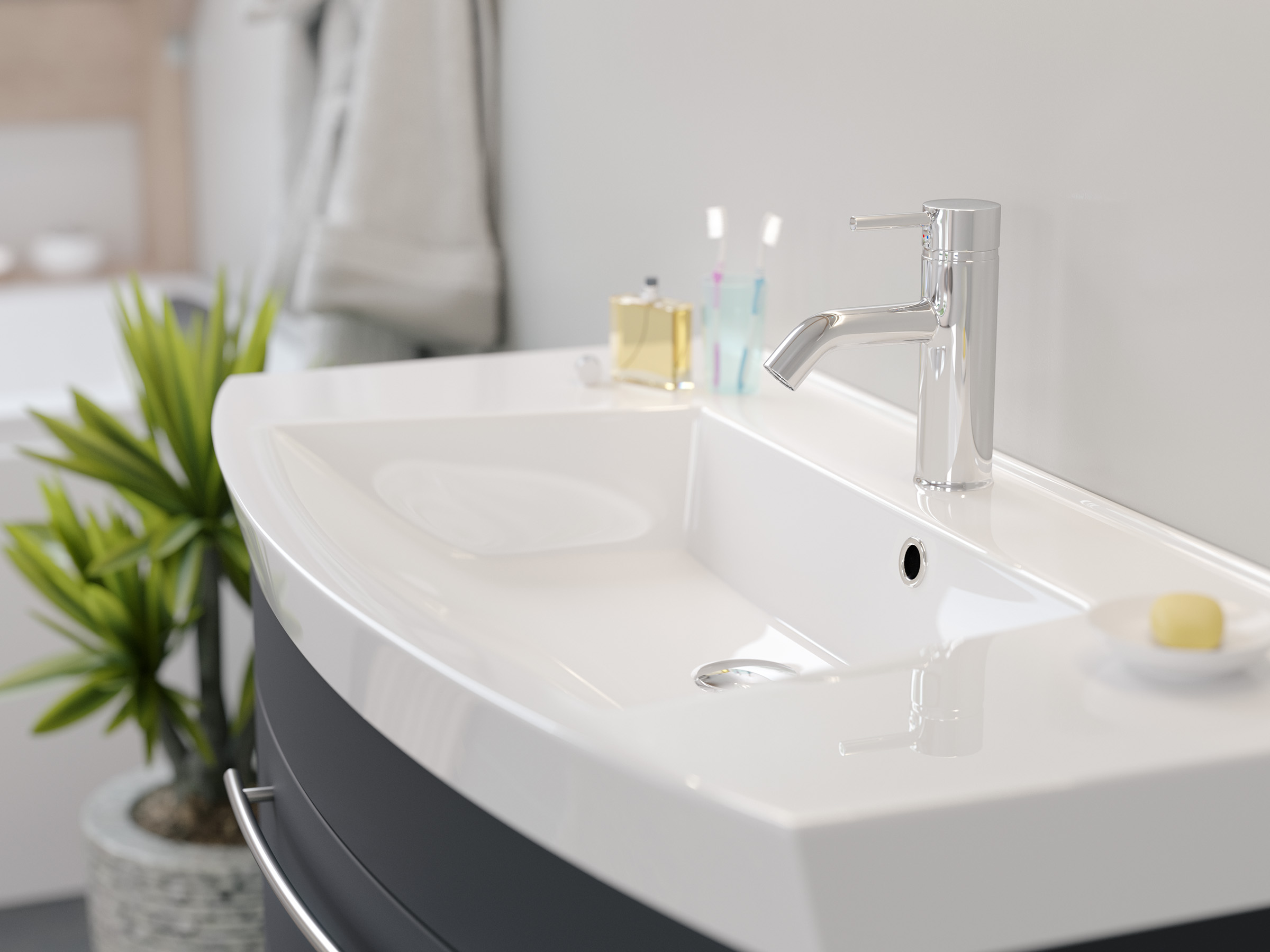 Mineralguss Waschbecken: Im praktischen Gebrauch immer beliebter ist ein Mineralguss-Waschbecken. Entstanden ist das flexible Material, weil Designer neue Formen ausprobieren wollten, die relativ einfach mit diesem inzwischen bewährten Badezimmermaterial hergestellt werden können. Auch in der Badmöbelserie BELLA kommt der Design-Aspekt groß zur Geltung in dem schönen Kontrast der abgerundeten Front mit der geraden Linienführung des Beckens.