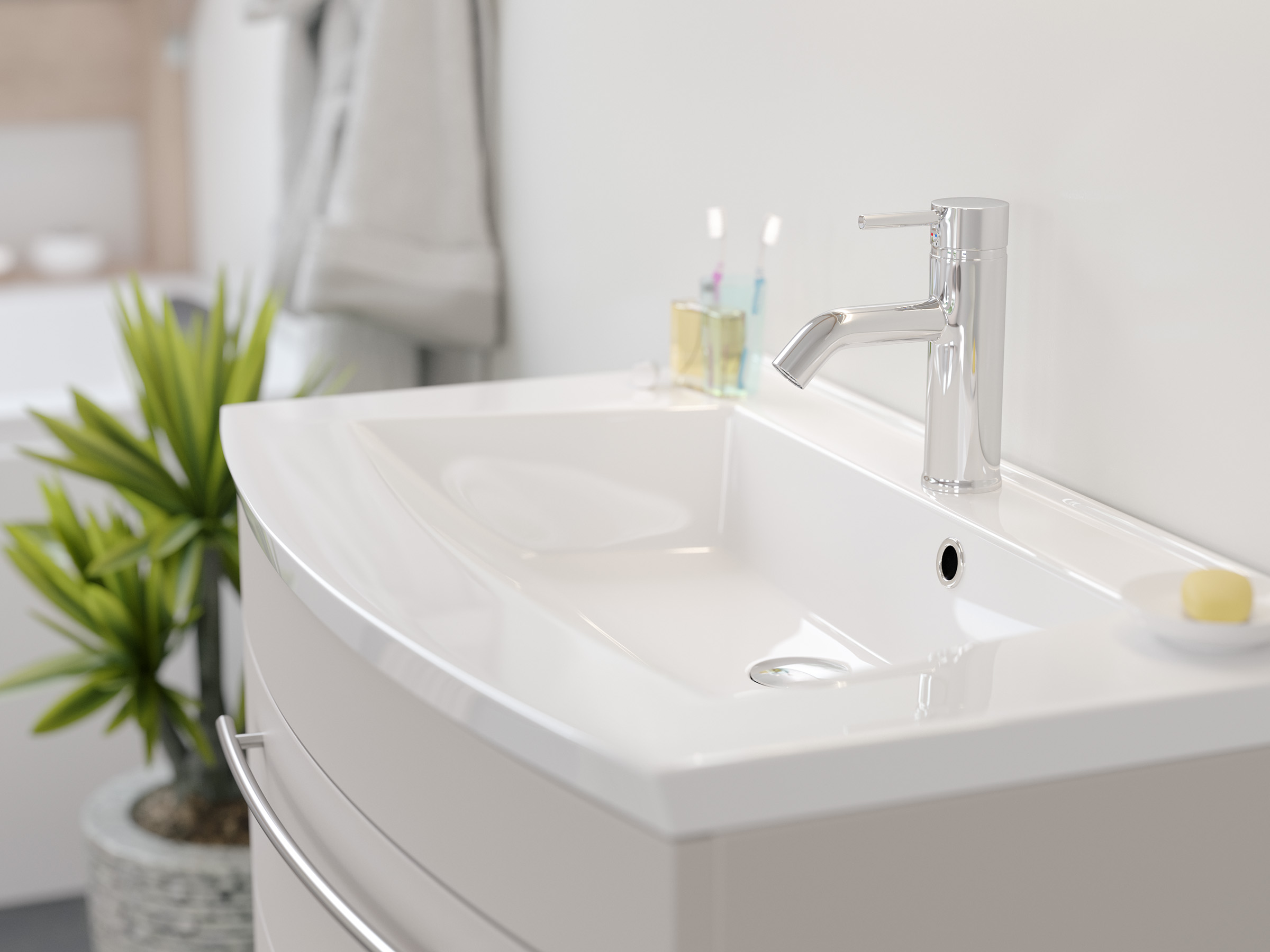 Mineralguss Waschbecken: Im praktischen Gebrauch immer beliebter ist ein Mineralguss-Waschbecken. Entstanden ist das flexible Material, weil Designer neue Formen ausprobieren wollten, die relativ einfach mit diesem inzwischen bewährten Badezimmermaterial hergestellt werden können. Auch in der Badmöbelserie BELLA kommt der Design-Aspekt groß zur Geltung in dem schönen Kontrast der abgerundeten Front mit der geraden Linienführung des Beckens.