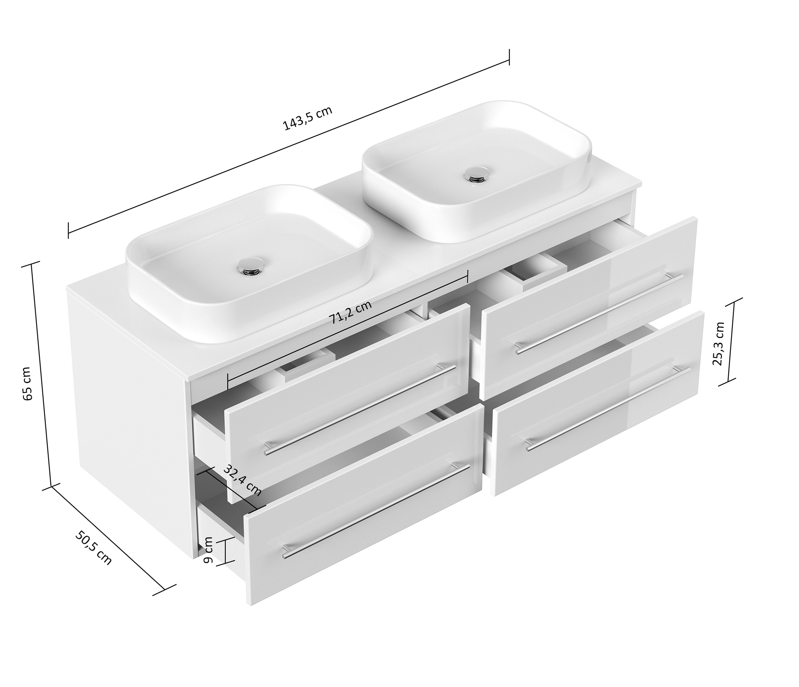 Badmöbel Waschtisch Unterschrank 4 Schubladen mit Softclose (B/H/T) 143,5/51,5/50,5 cm.