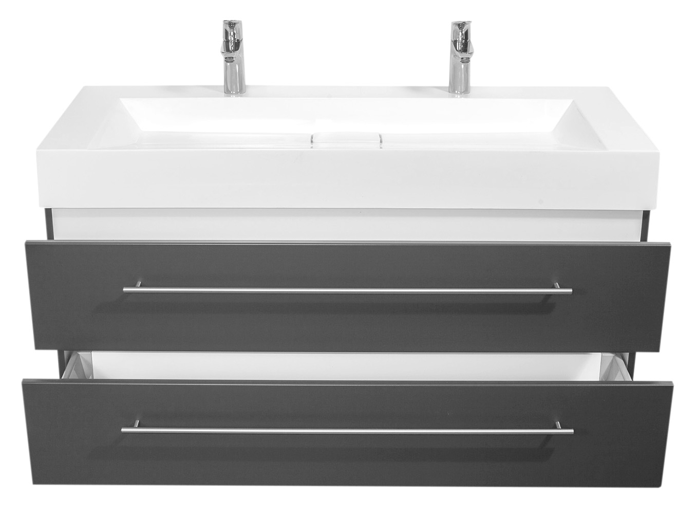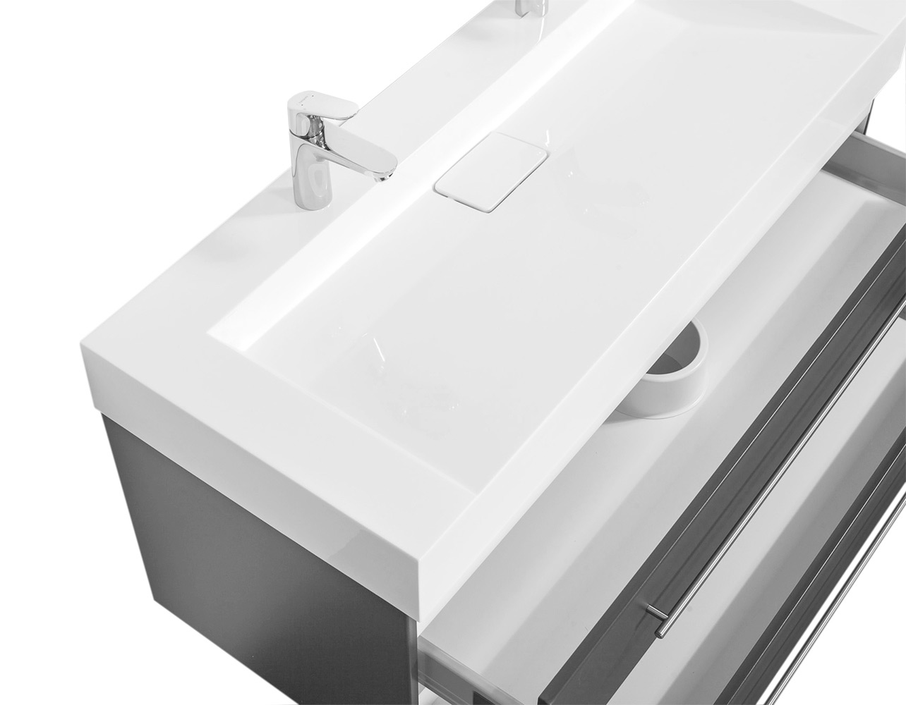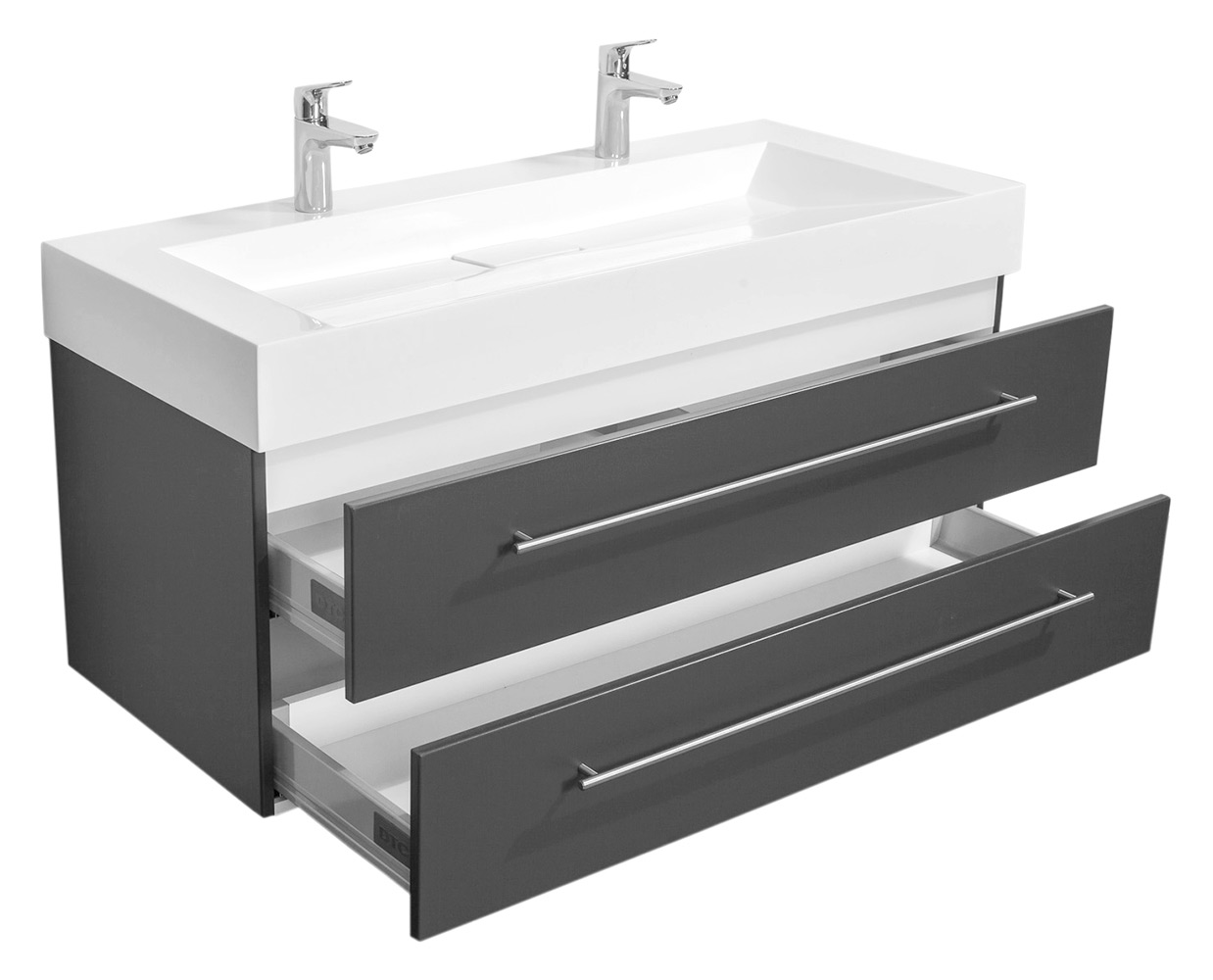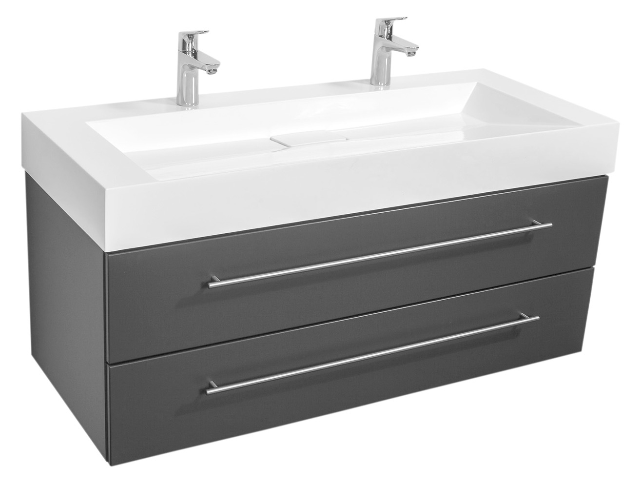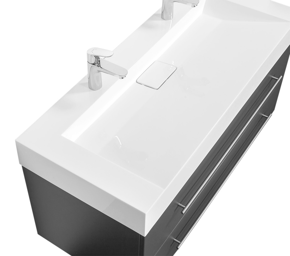 Erleben Sie Ihr Badezimmer mit dem "Design 1200" in völlig neuer optischer Brillianz. Das Design 1200 Badmöbel definiert sich ganz klar über den Mineralgusswaschtisch und seinen "Ecken und Kanten", sowie den zentrierten Ablauf in der Mitte des Waschbeckens.