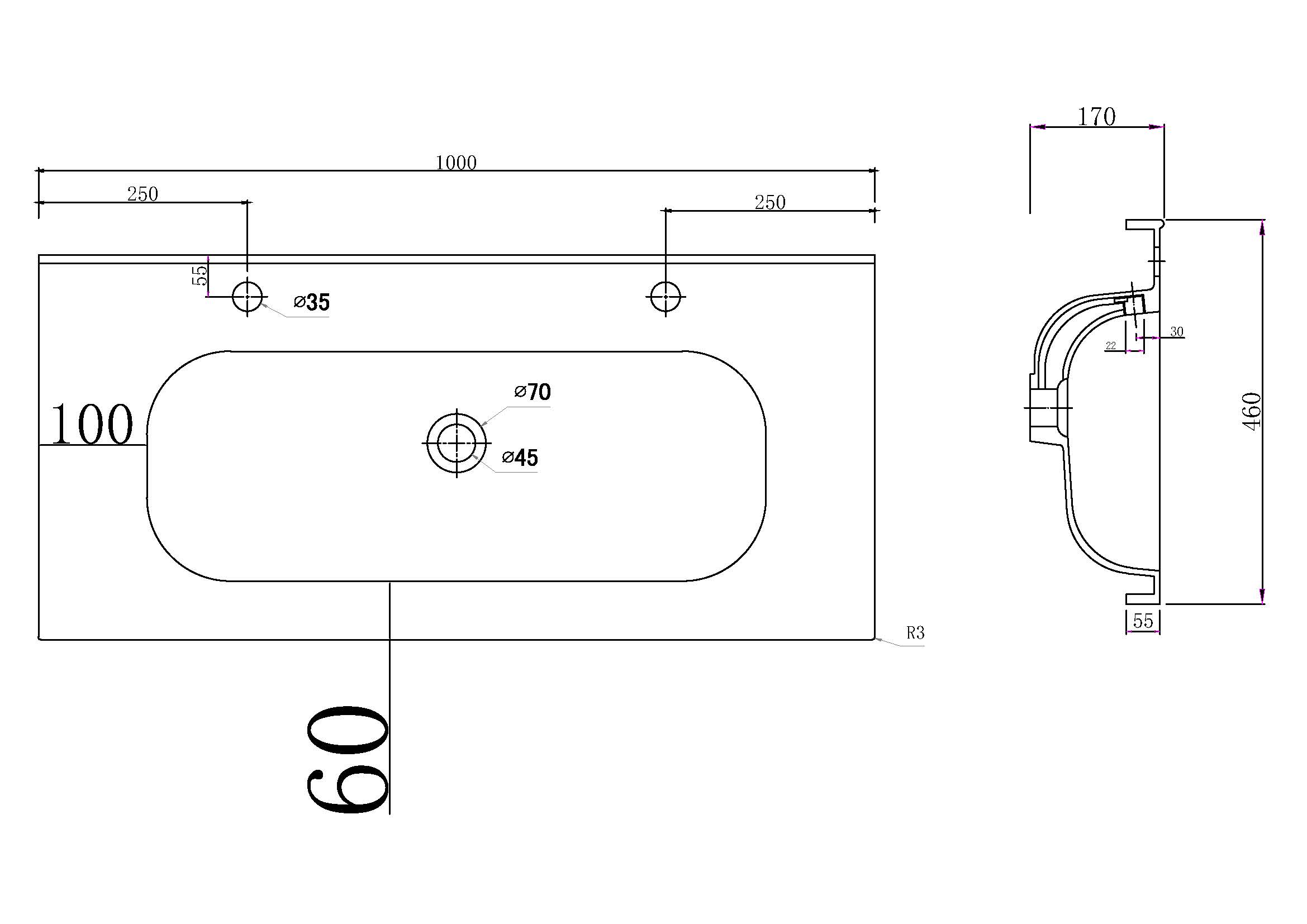 Waschbeckenunterschrank (B/H/T) 99/48/45,5 cmWaschbecken Keramik mit zwei Hahnlöcher (B/H/T) 100/4/46 cm