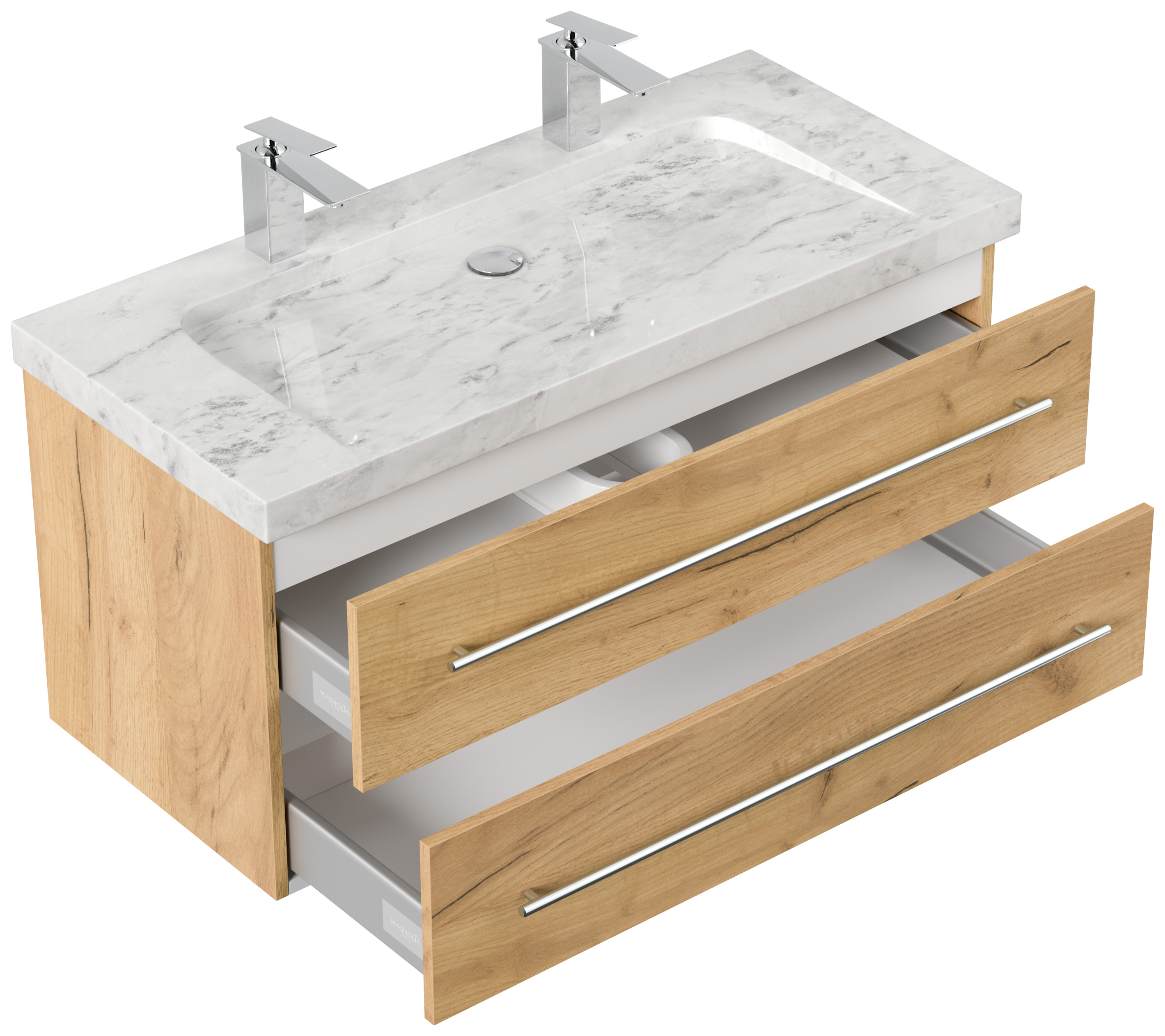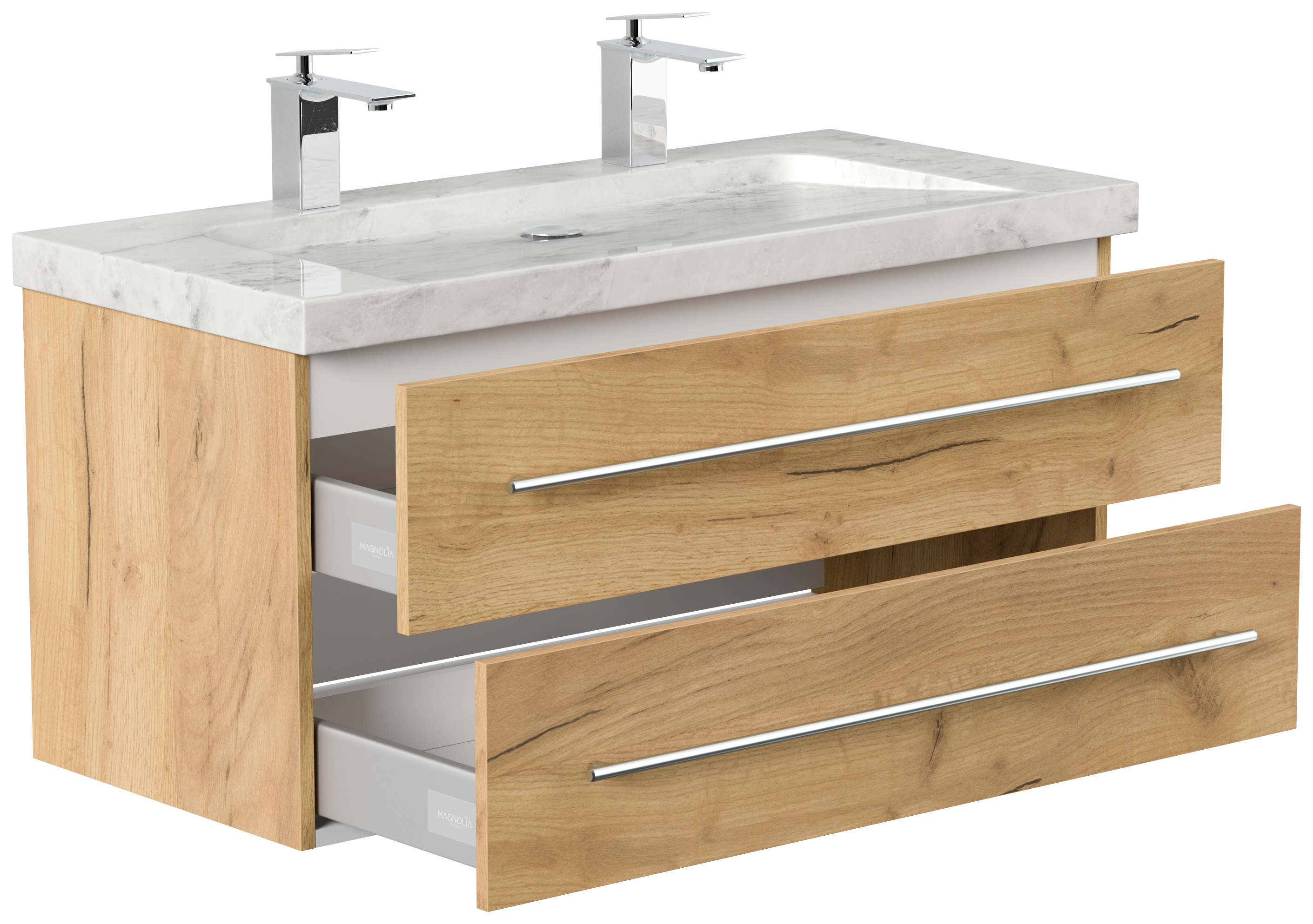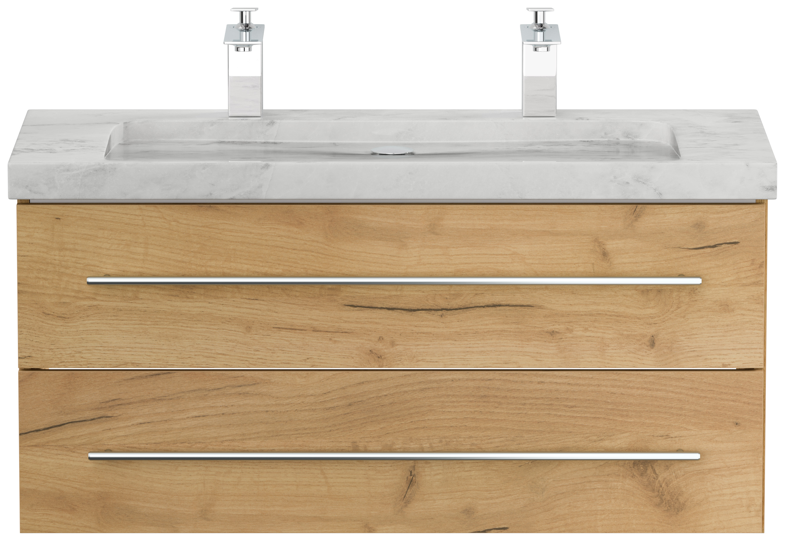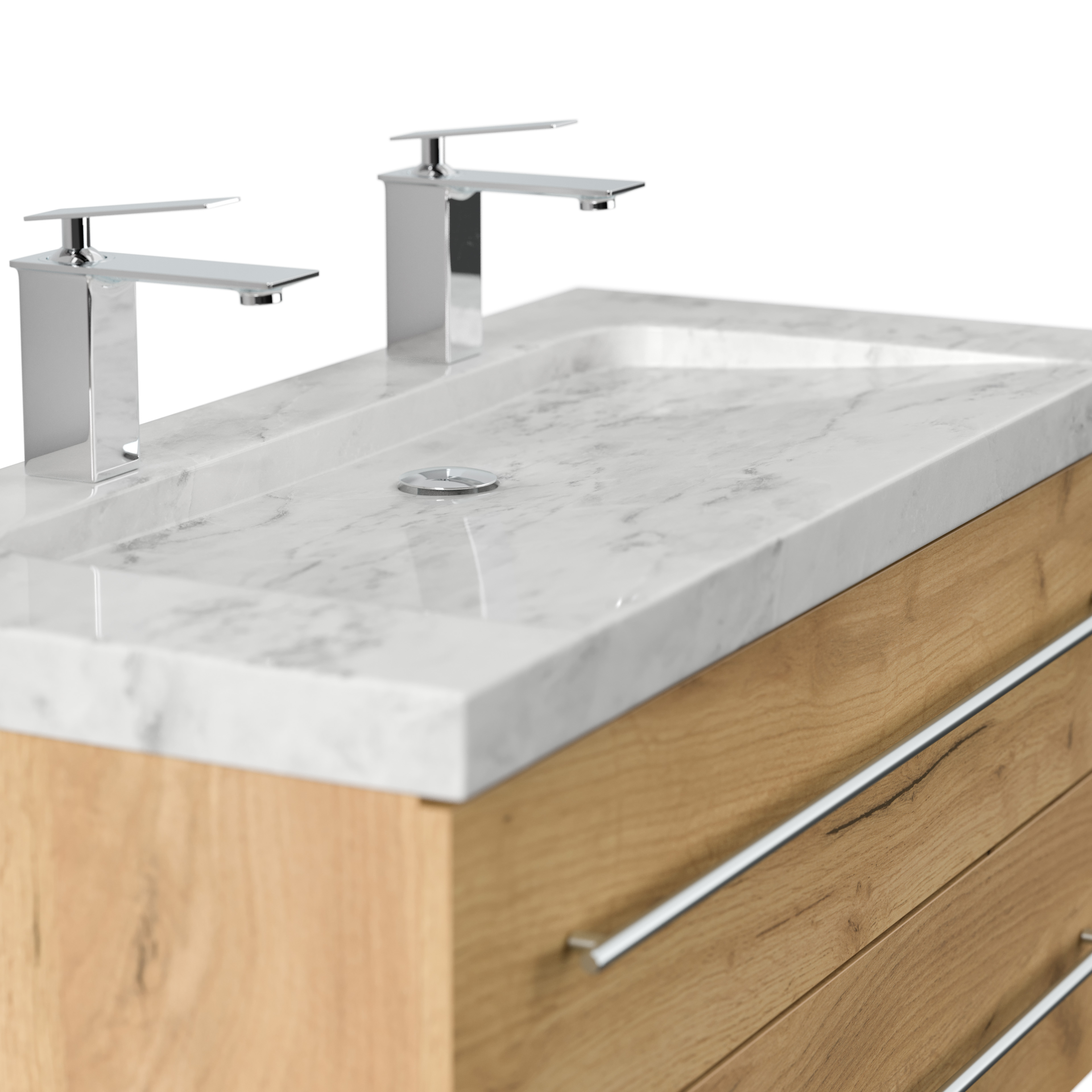 Badmöbel Marmor Carrara White Damo 100 cm 2 Hahnlöcher SoftClose eiche gold