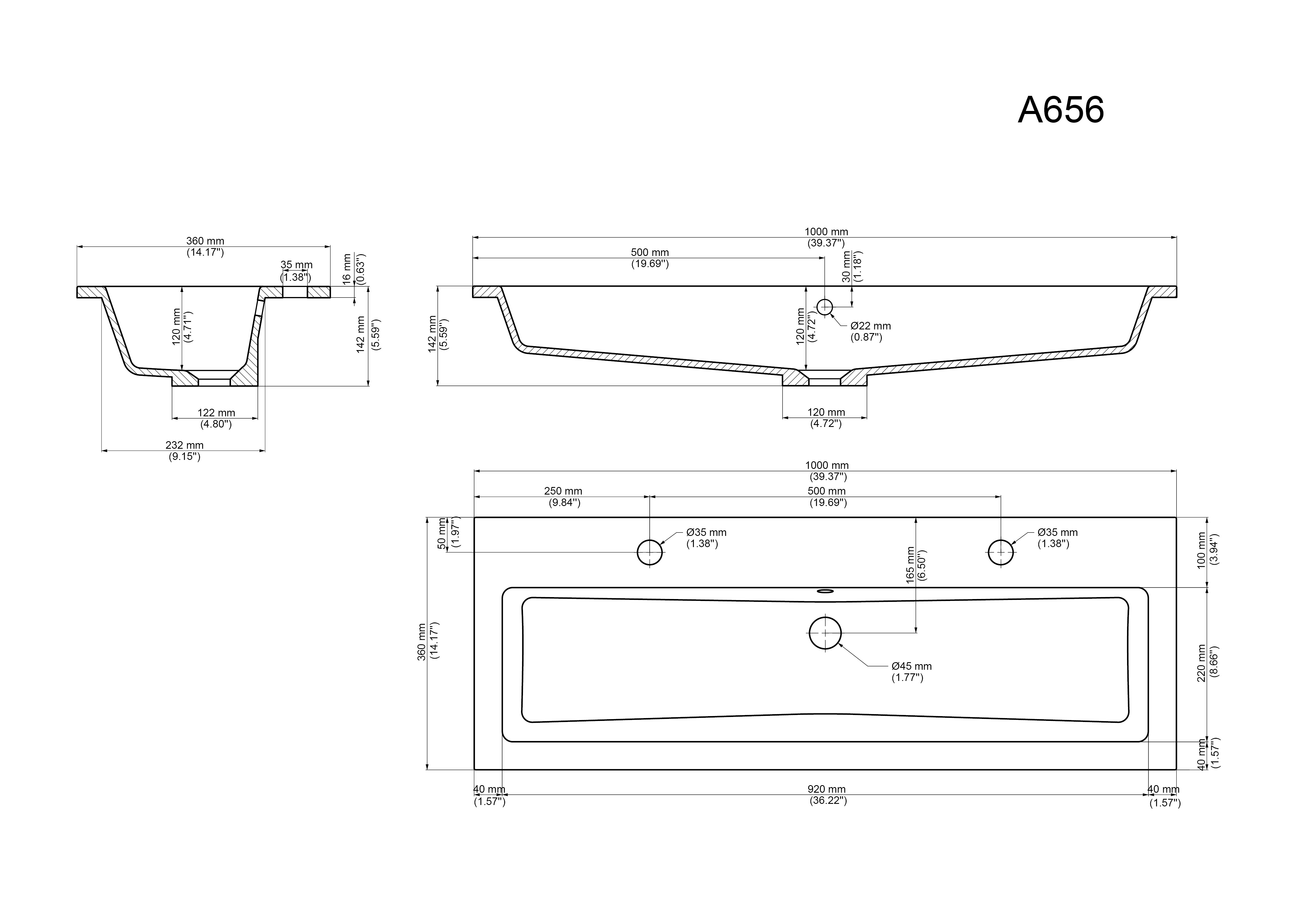 Waschbecken Mineralguss mit Überlauf mit zwei Hahnlöcher (B/T) 100/36 cm.