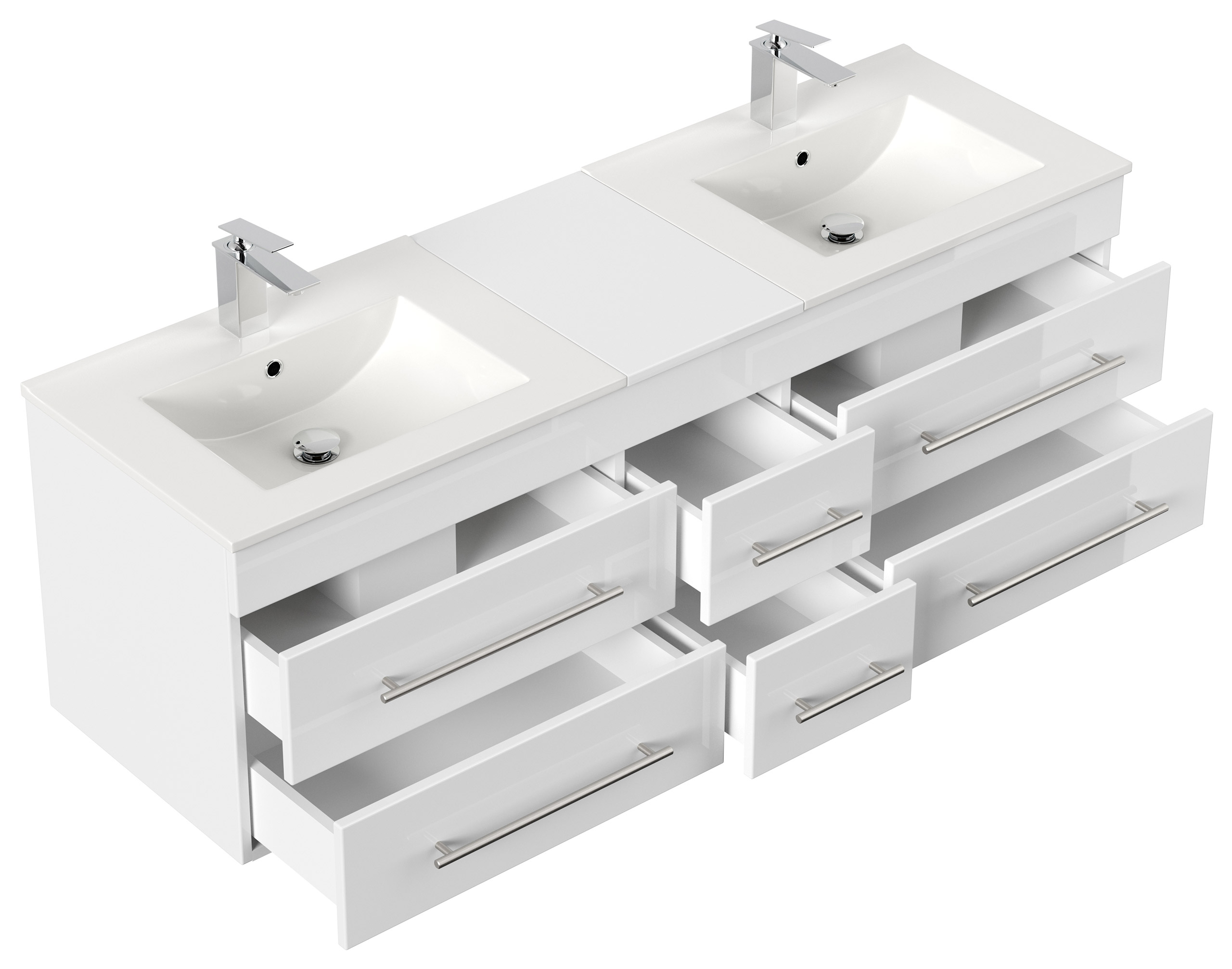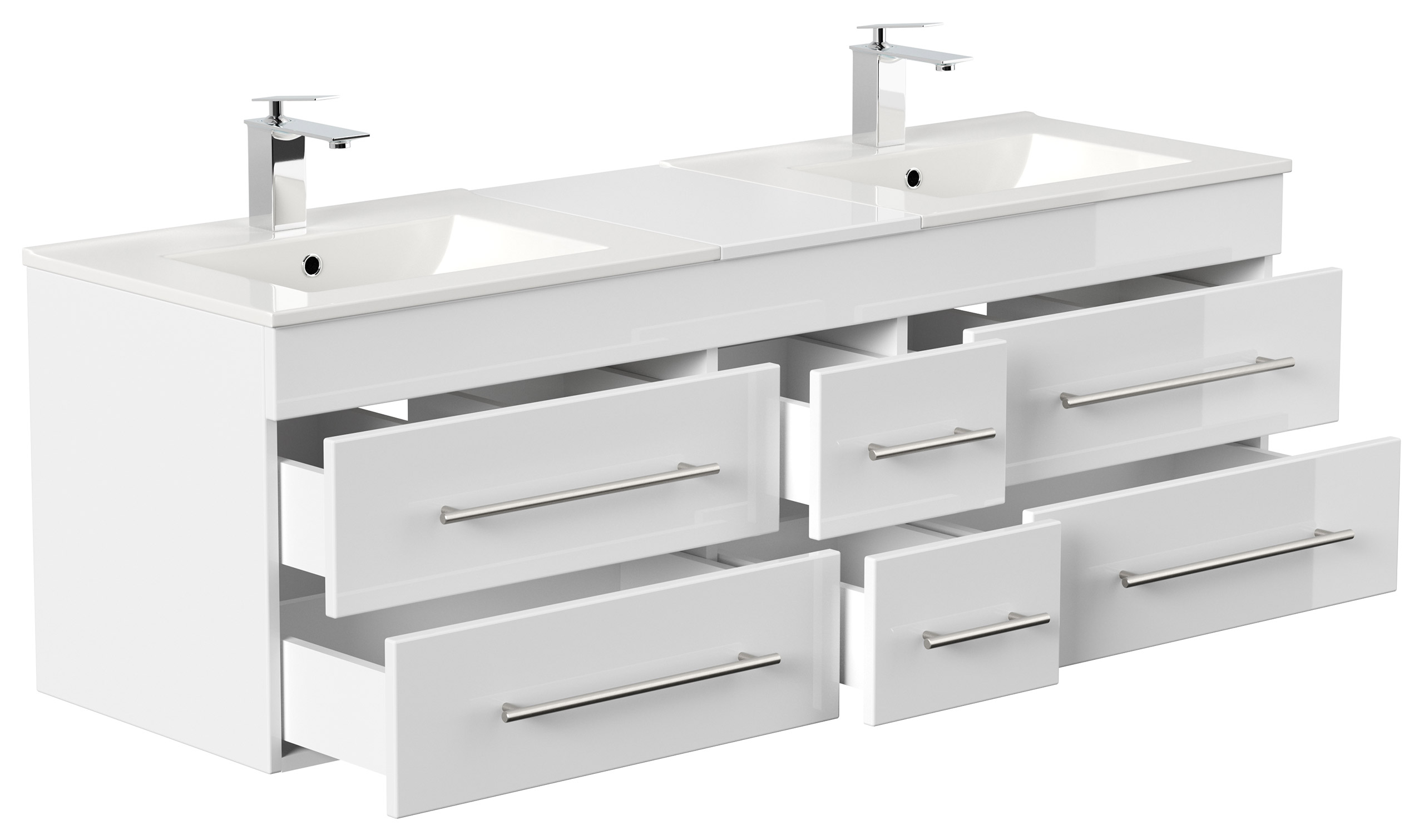 Wer in einem geräumigen Badezimmer auf edles Design seiner Badmöbel Wert legt, findet mit der Serie Roma XL in Weiss hochglanz eine zeitlose Einrichtung für zwei Personen. Sechs geräumige Schubladen bieten praktische Vorzüge und die hängende Anbringung der Designer Badmöbel ist optisch überaus reizvoll.