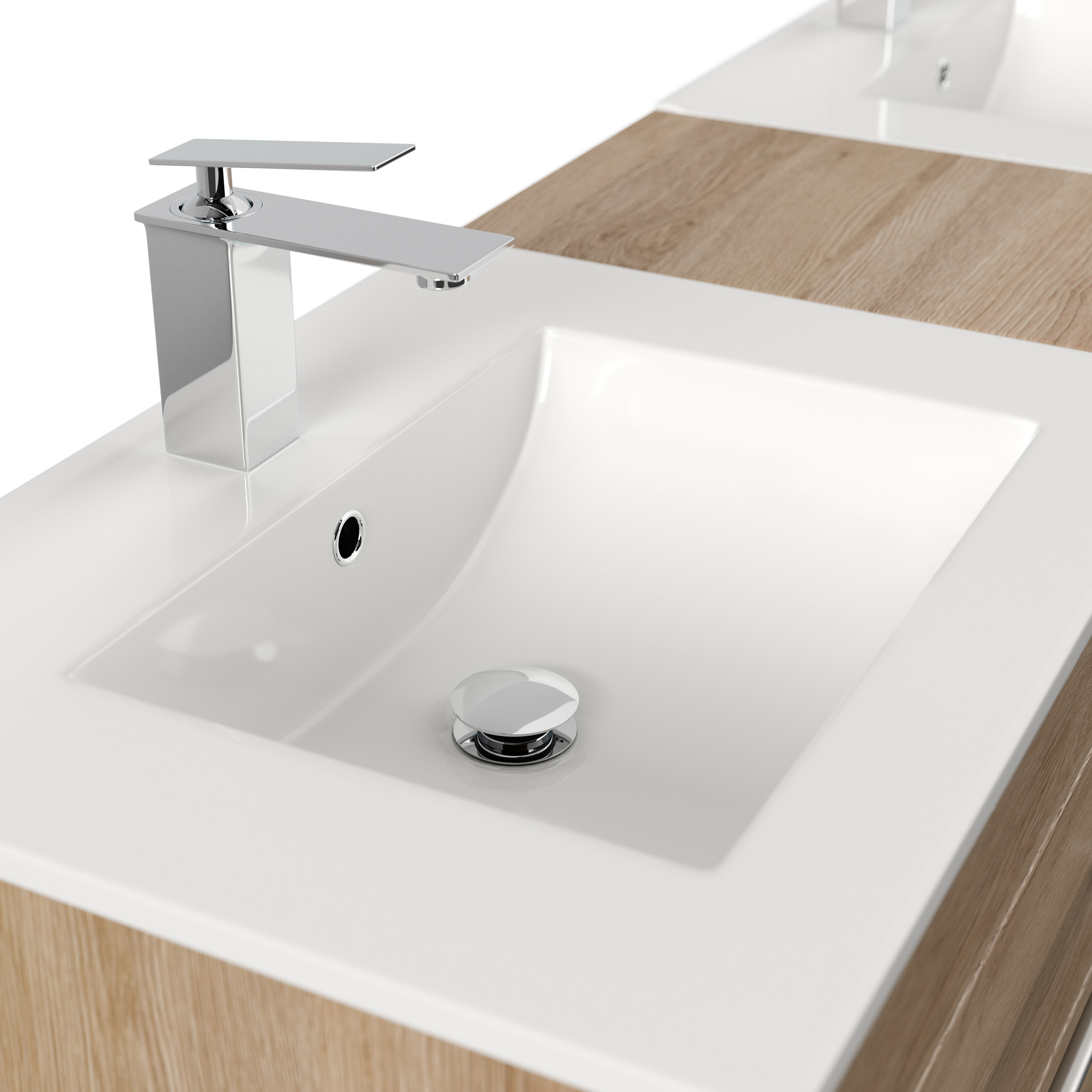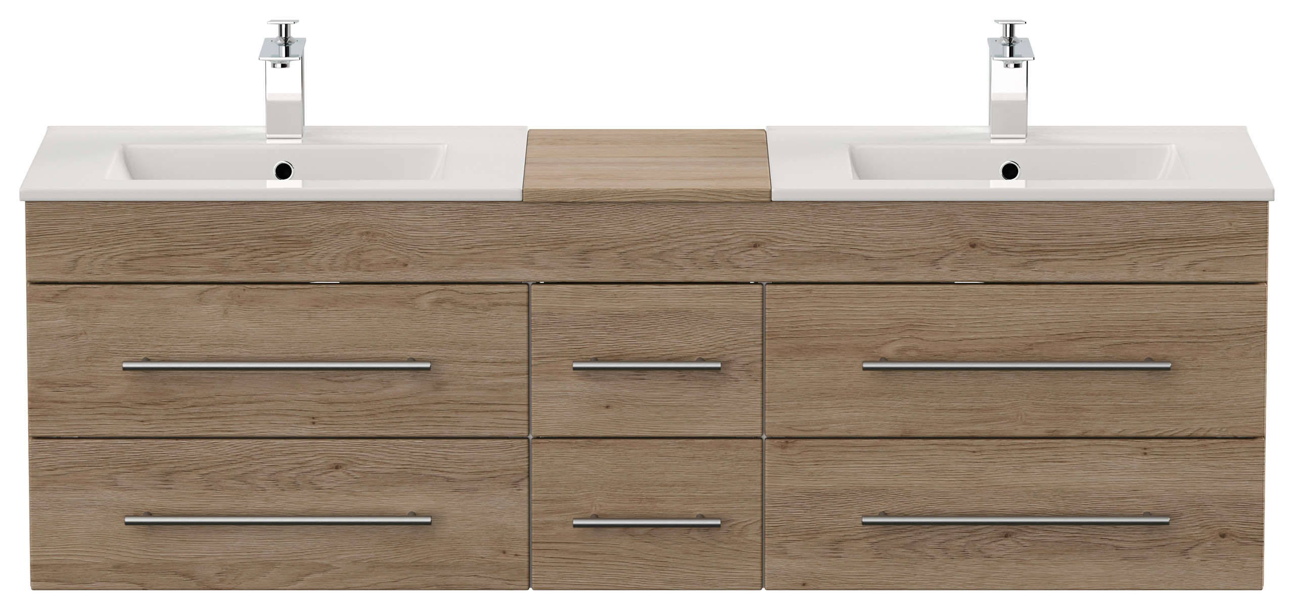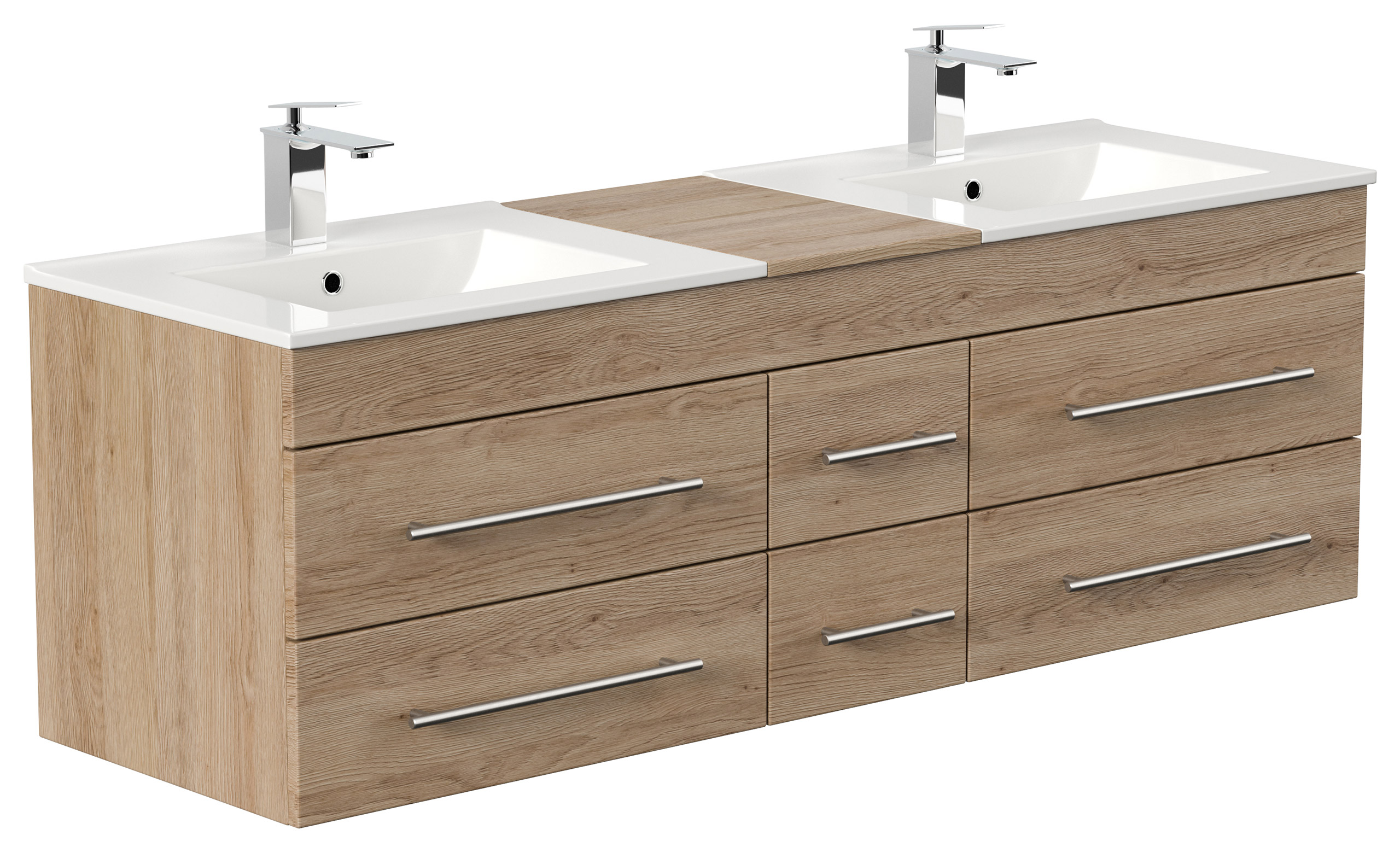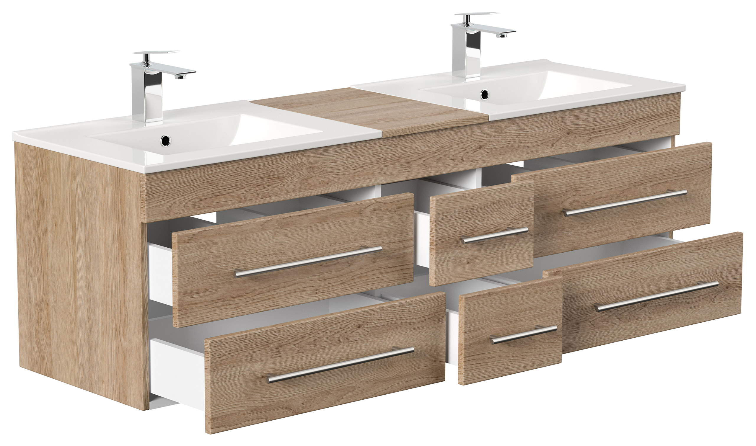 Mit Badmöbel Roma XL erwerben Sie ein wandhängendes Möbel mit zwei Waschbecken, das als Synonym für Luxus im Bad steht. Es erhöht die Individualität der Körperpflege und bietet darüber hinaus üppigen Stauraum. Der große Waschtischunterschrank wird in edlem Eiche-hell Dekor, matt glänzend, geliefert. Die beiden jeweils 61,5 cm breiten, weißen Keramik-Waschbecken werden so in den Waschtischunterschrank eingesetzt, dass noch ein Streifen des Holzdekors in Eiche - hell auf der Abdeckplatte des Möbels zur Wirkung kommen kann. Insgesamt sechs Schubladen lassen keine Wünsche bei der Zuordnung von Utensilien für die Körperpflege offen. Sie verfügen über die bedienerfreundliche Soft-Close-Funktion, welche das selbsttätige und leise Schließen der Schubladen ermöglicht. Die breiten Griffe der Schubladen bestehen aus schwerem, matt gebürstetem Edelstahl. Gegen von außen eindringende Feuchtigkeit ist das Badmöbel mit einer hochwertigen Markenbeschichtung sowie der edlen Möbelfolie im Eiche-hell Dekor geschützt.