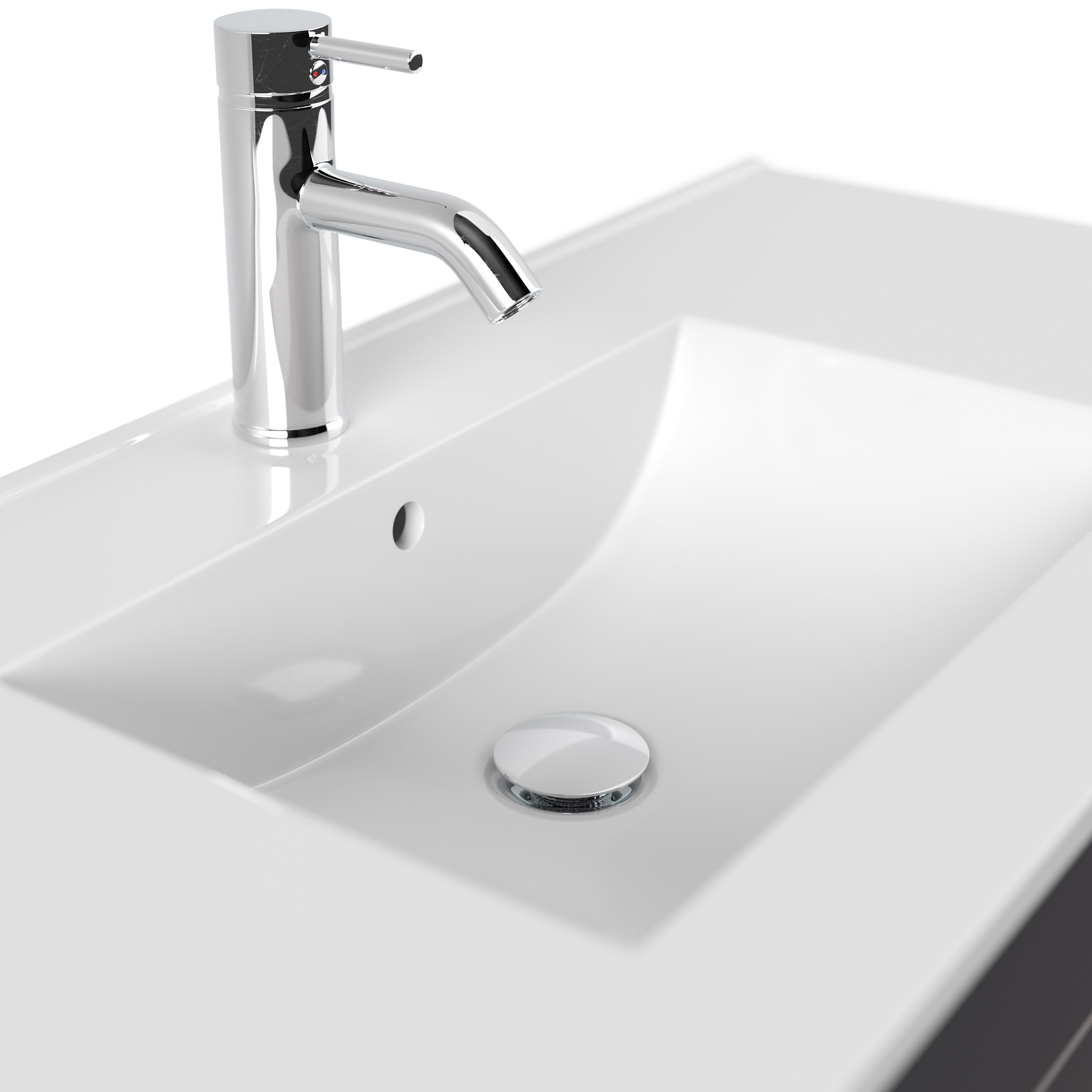 Waschbecken Keramik mit Überlauf (B/H/T) 101/2/47 cm.Waschbeckenunterschrank mit Soft-Close Schubladen und Siphon-Ausschnitt: