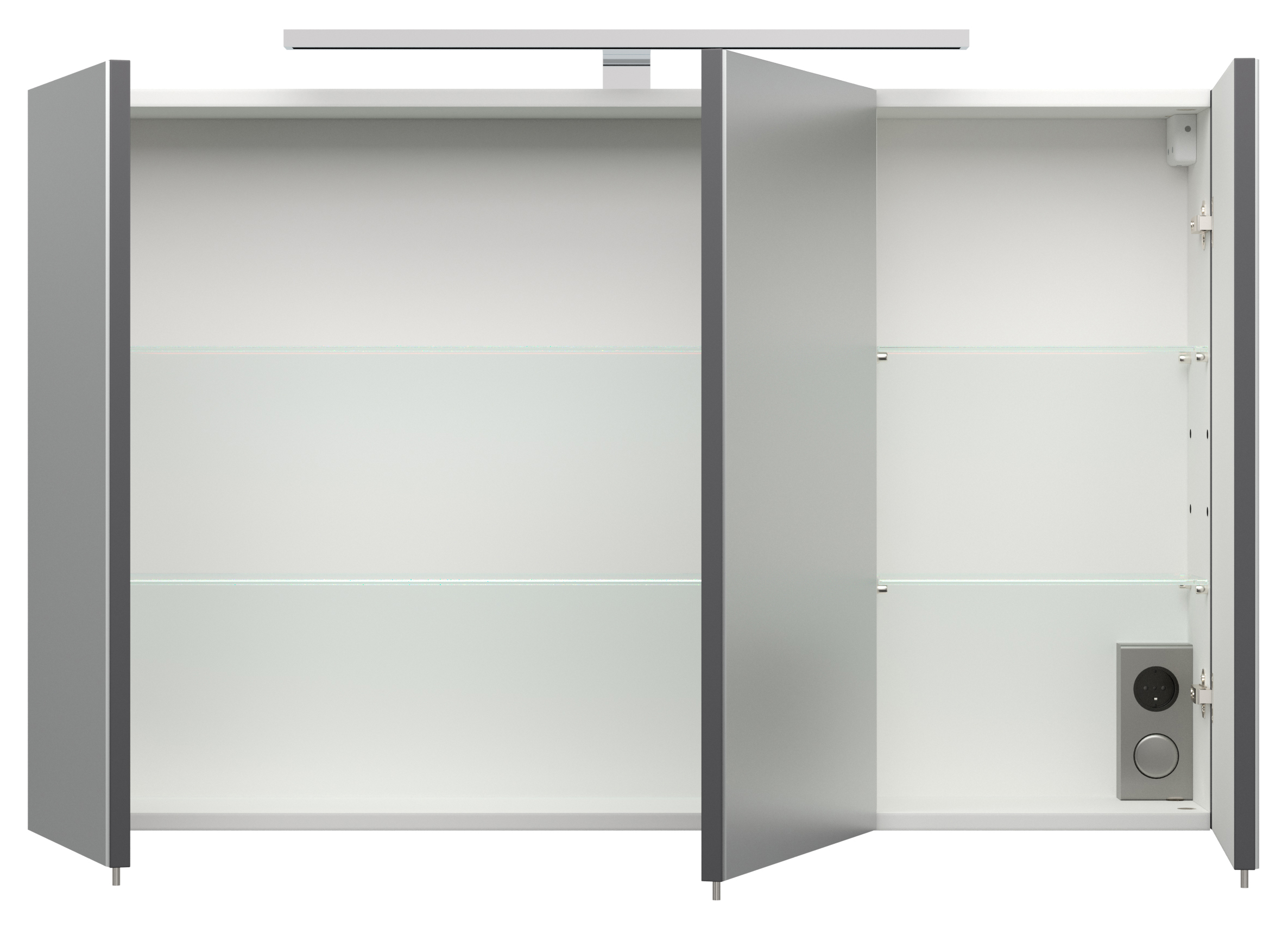 Maße (B x H x T): 99 cm x 48 cm 45,5 cmSpiegelschrank 100, inkl. Soft-Close-Türe/n mit Spiegel, 2 Regalböden aus Glas, Kombibox im Spiegelschrank mit Lichtschalter und Steckdose (B/H/T) 100/62/17 cm.