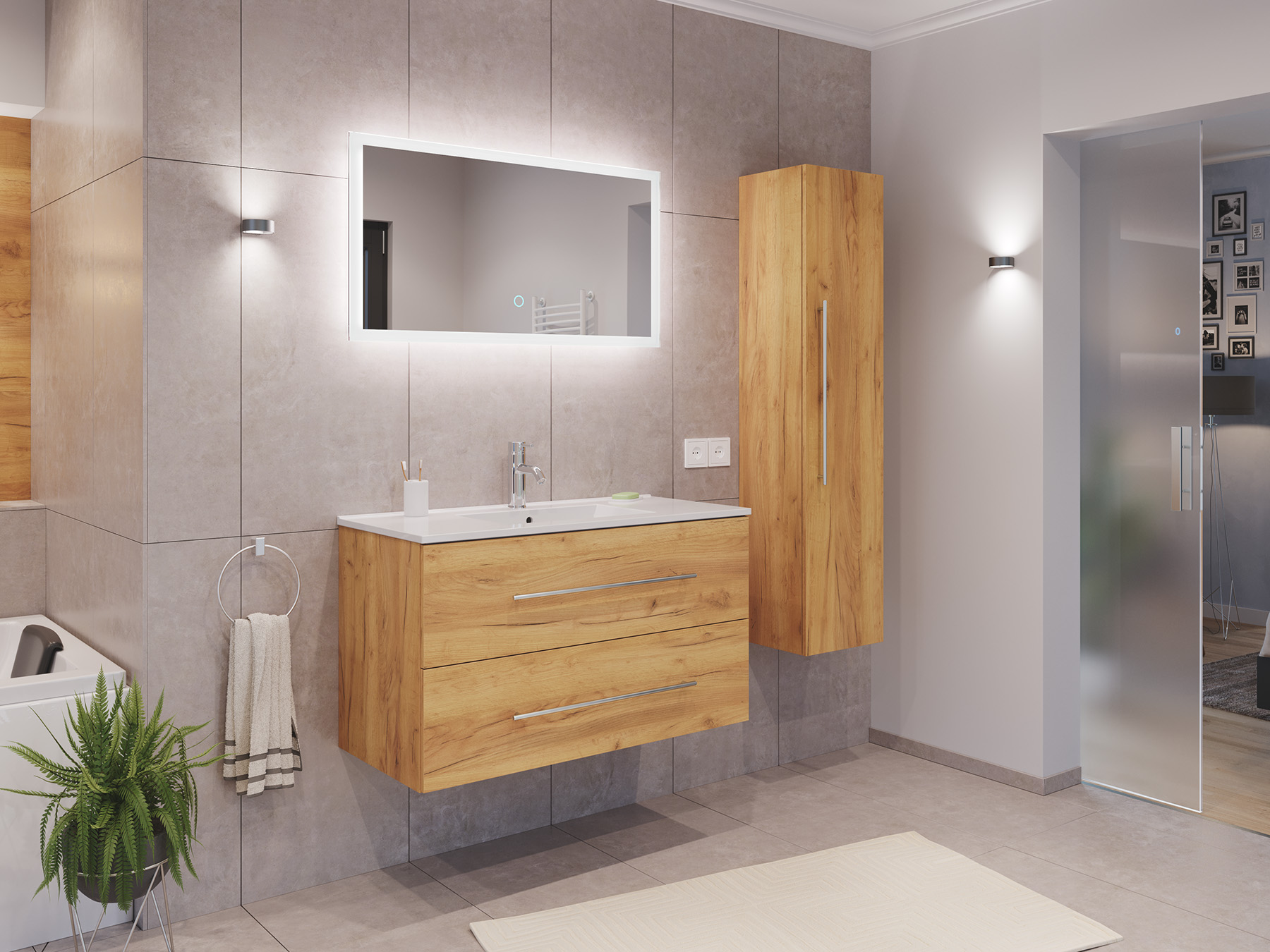 Badmöbel Set Firenze 100 3tlg. LED Spiegel und Hochschrank eiche gold