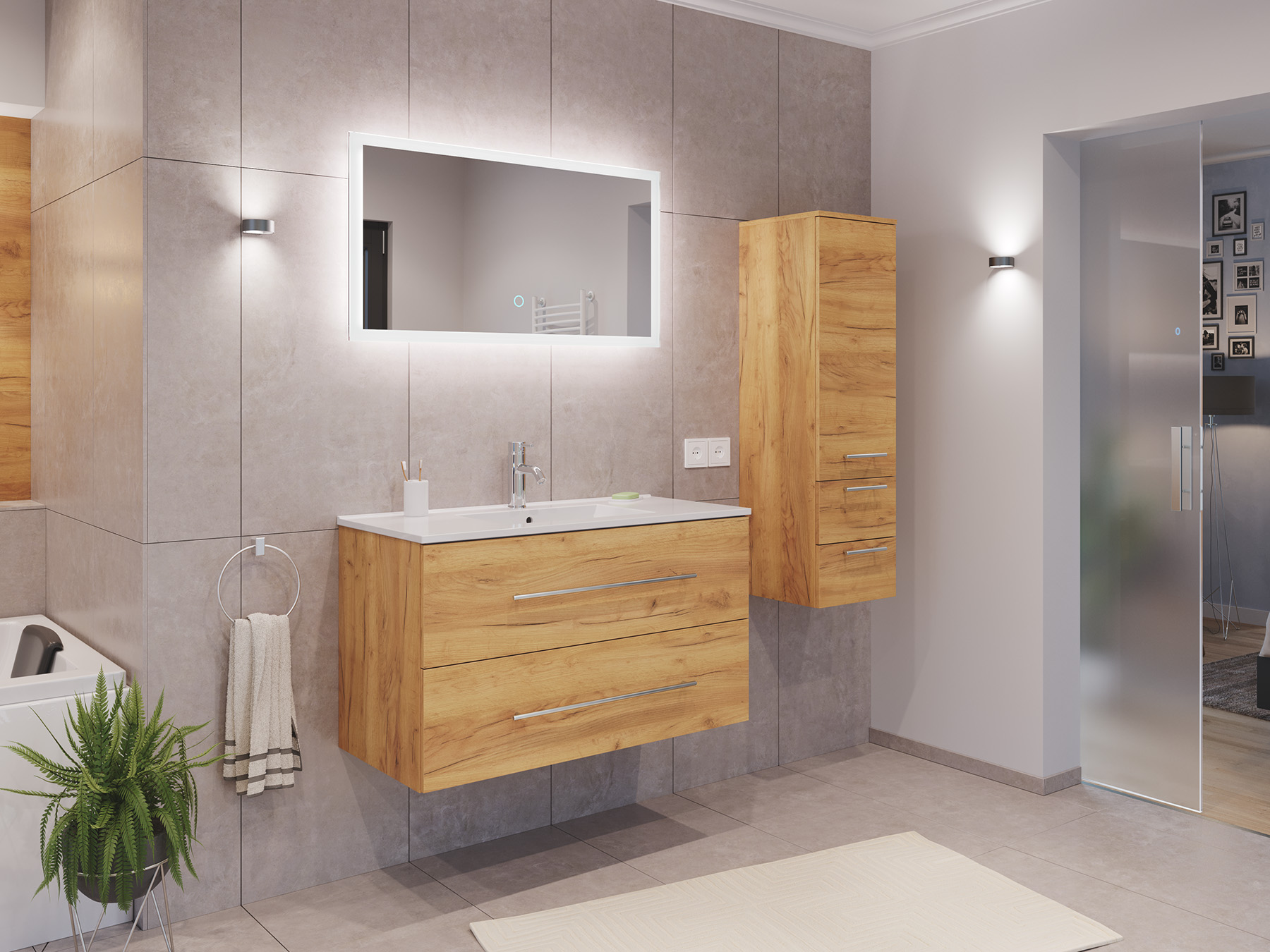 Badmöbel Set Firenze 100 3tlg. LED Spiegel und Seitenschrank eiche gold