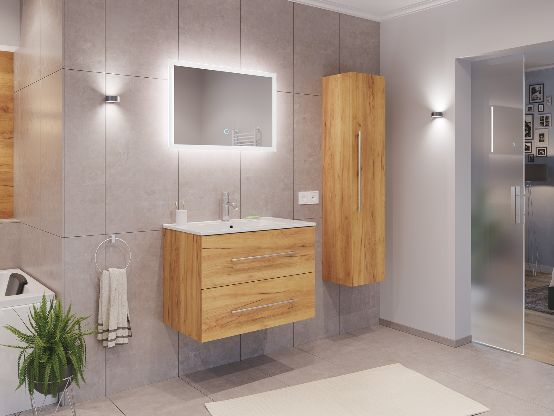 Badmöbel Set Firenze 80 3tlg. LED Spiegel und Hochschrank eiche gold