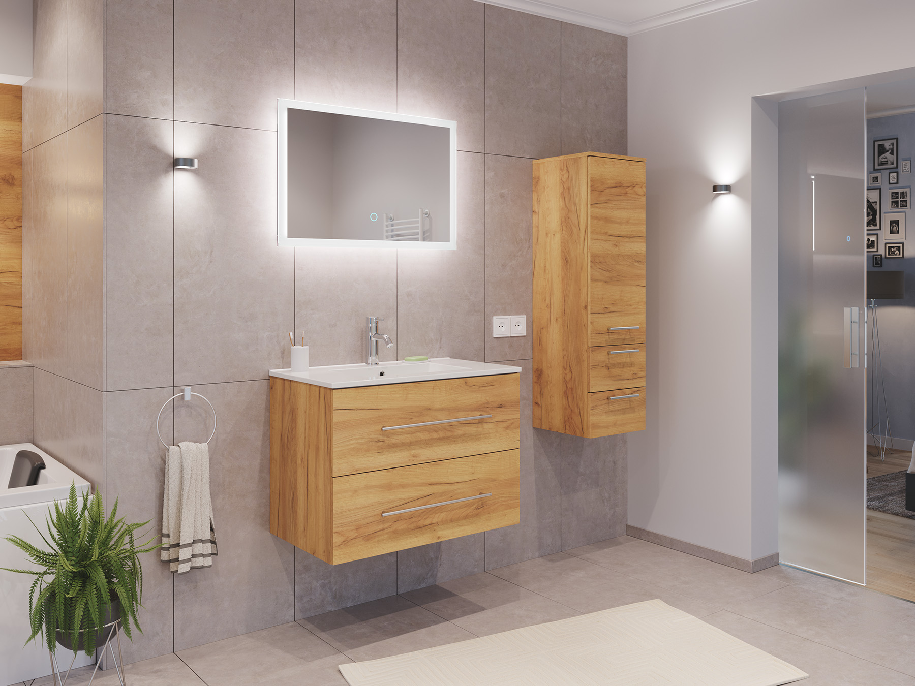 Badmöbel Set Firenze 80 3tlg. LED Spiegel und Seitenschrank eiche gold