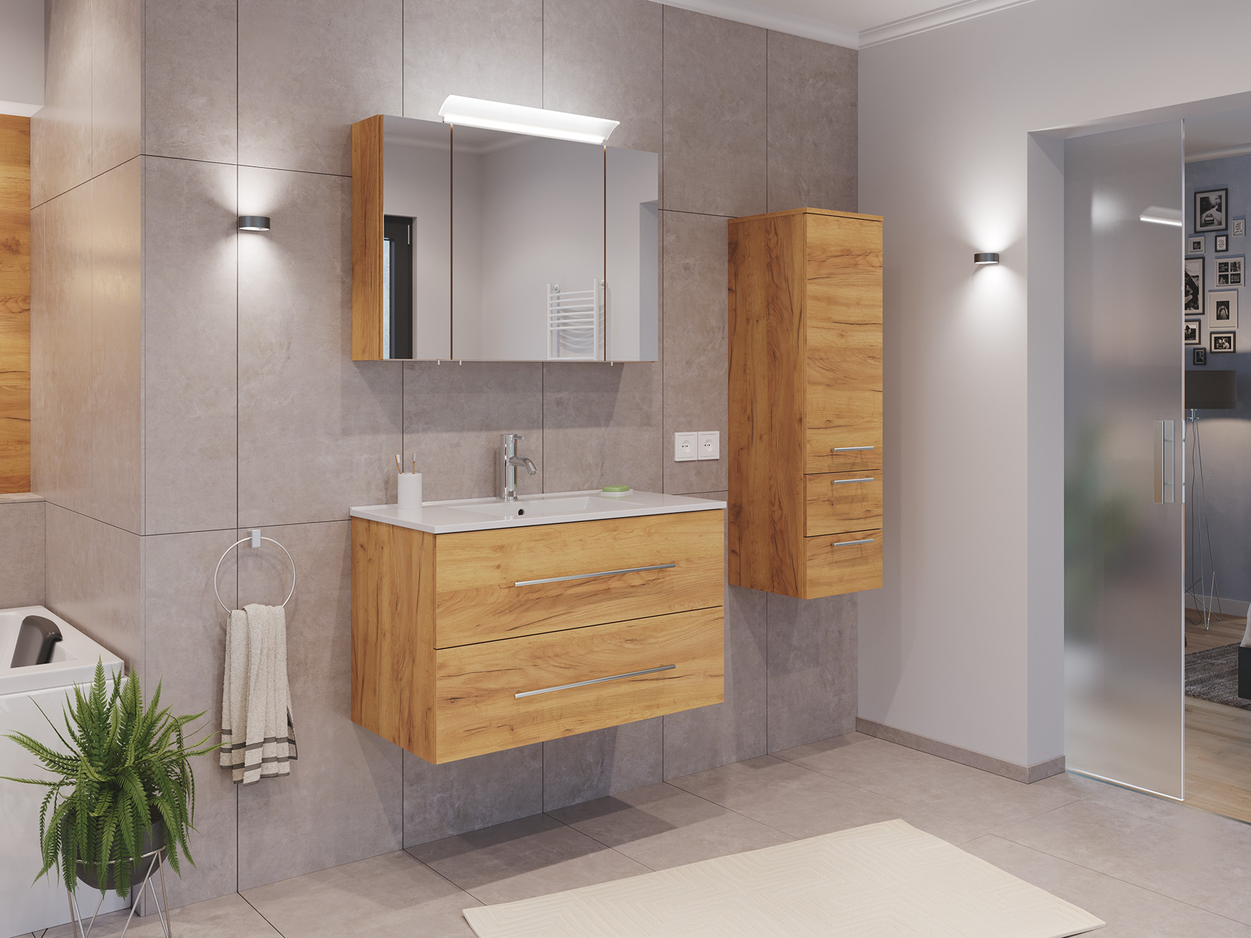 Badmöbel Set Firenze 90 3tlg. Spiegelschrank & Seitenschrank eiche gold