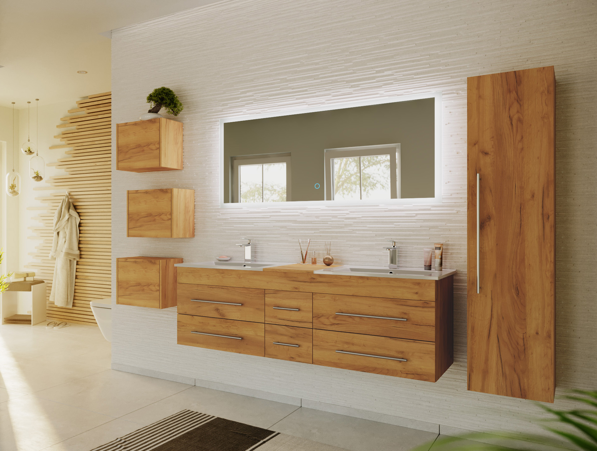 Badmöbelset Roma XL 4-teilig LED-Spiegel Hochschrank 3er Boxen eiche gold