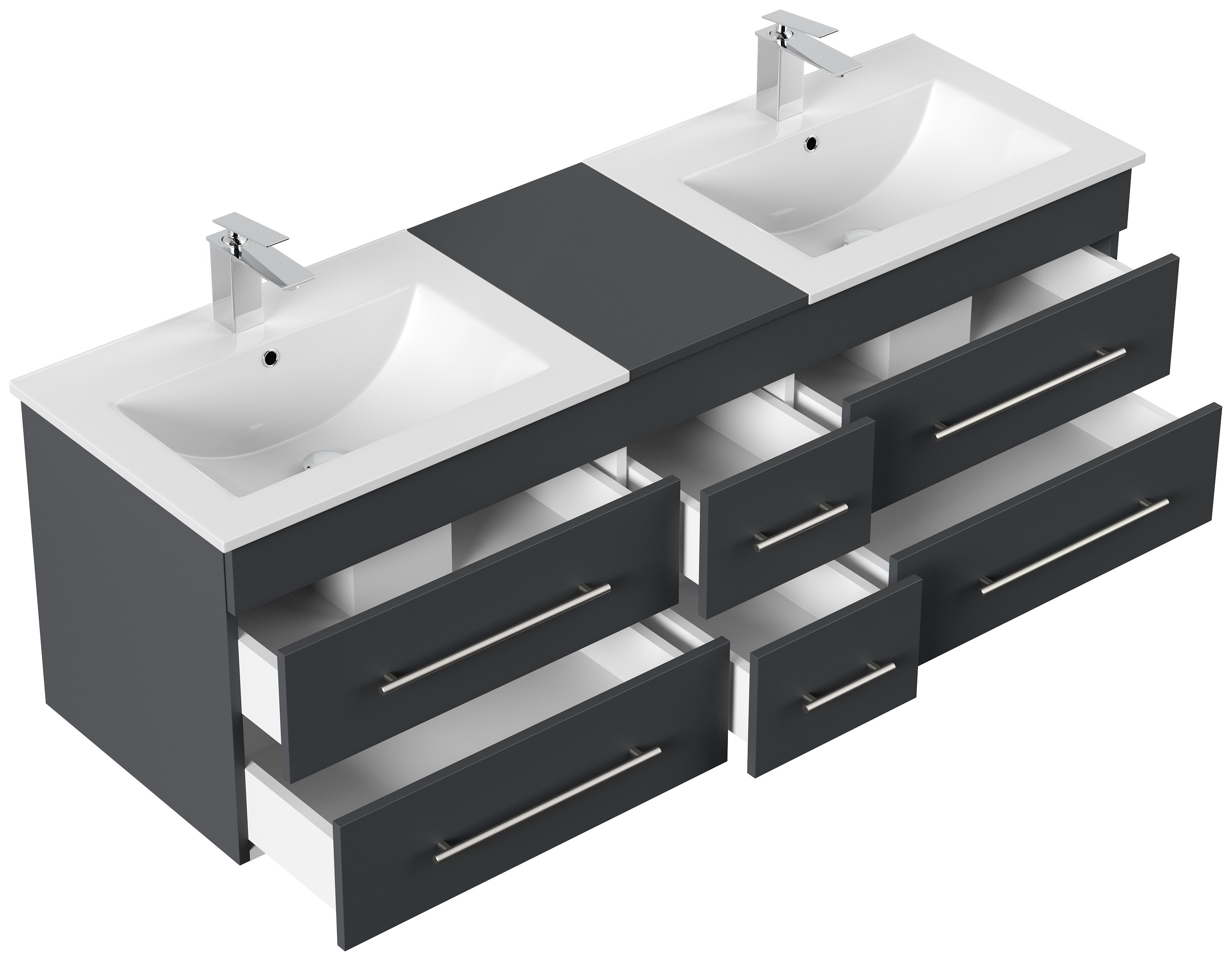 | Lieferumfang | Waschtischunterschrank, 2 Waschbecken, Hochschrank, Hängeschrank, Midischrank, LED-Spiegel, Montageanleitung |