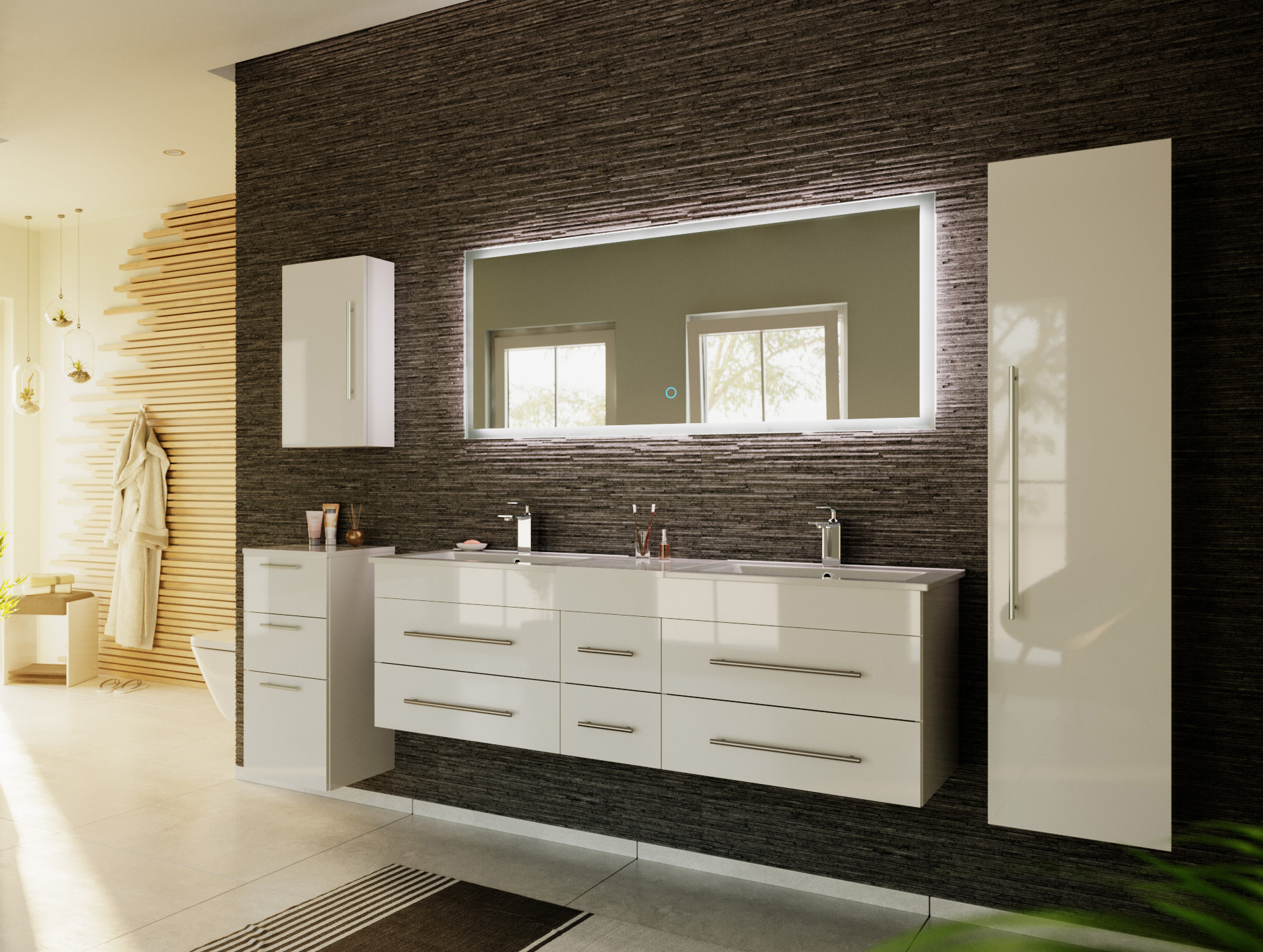 | Lieferumfang | Waschtischunterschrank, 2 Waschbecken, Hochschrank, Hängeschrank, Midischrank, LED-Spiegel, Montageanleitung |