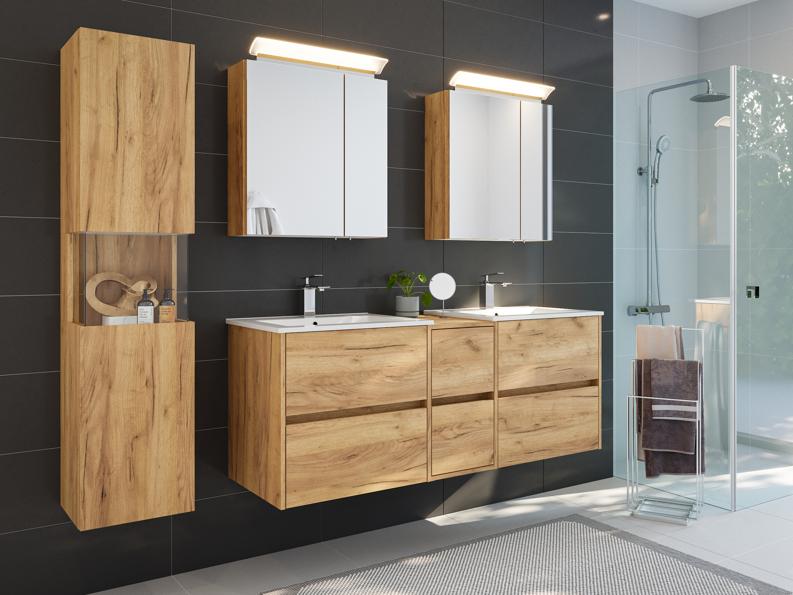 Badmöbelset Taifun 150cm 4tlg mit 2x Spiegelschrank & Seitenschrank eiche gold