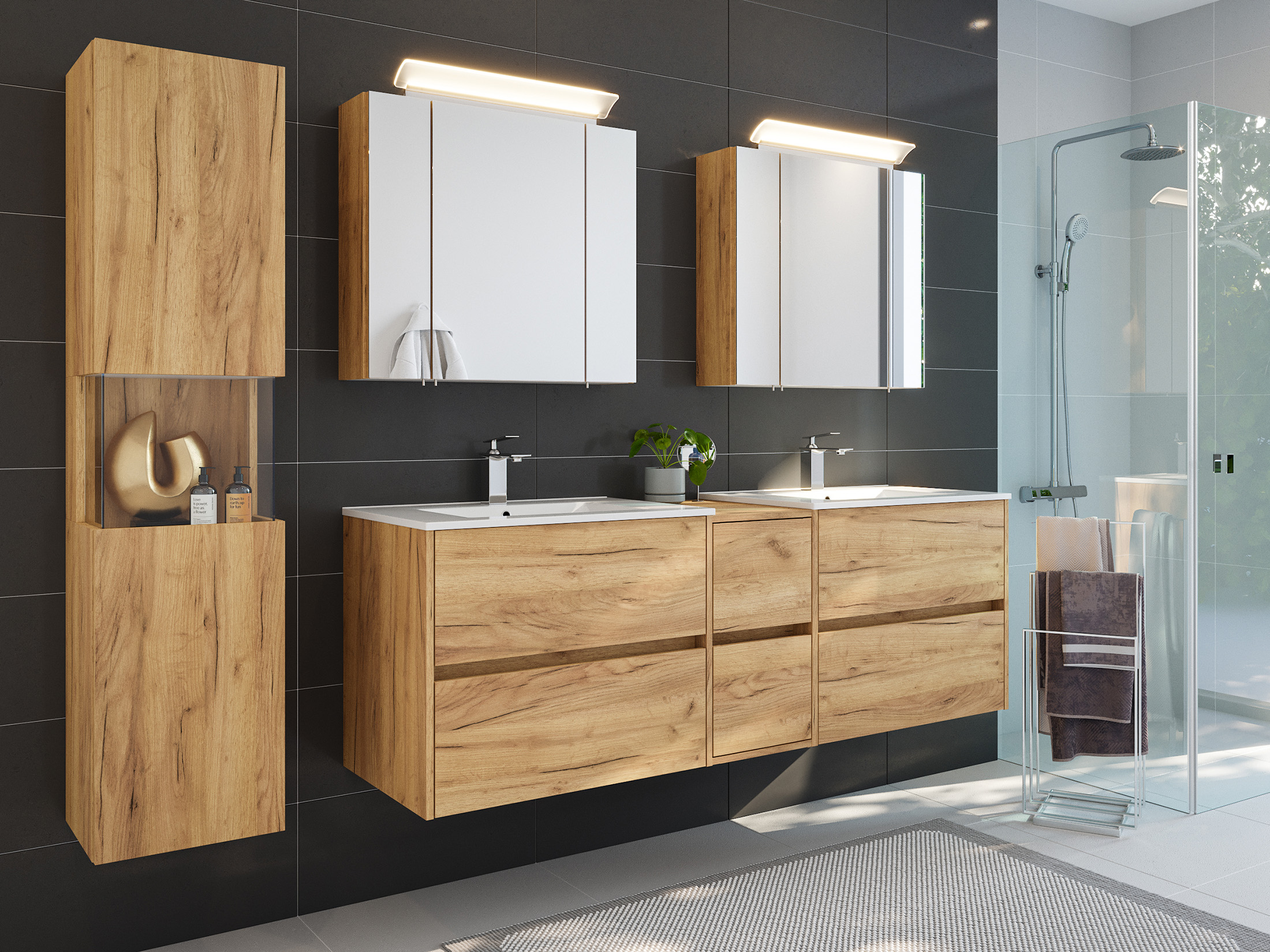 Badmöbelset Taifun 170cm 4tlg mit 2x Spiegelschrank & Seitenschrank eiche gold