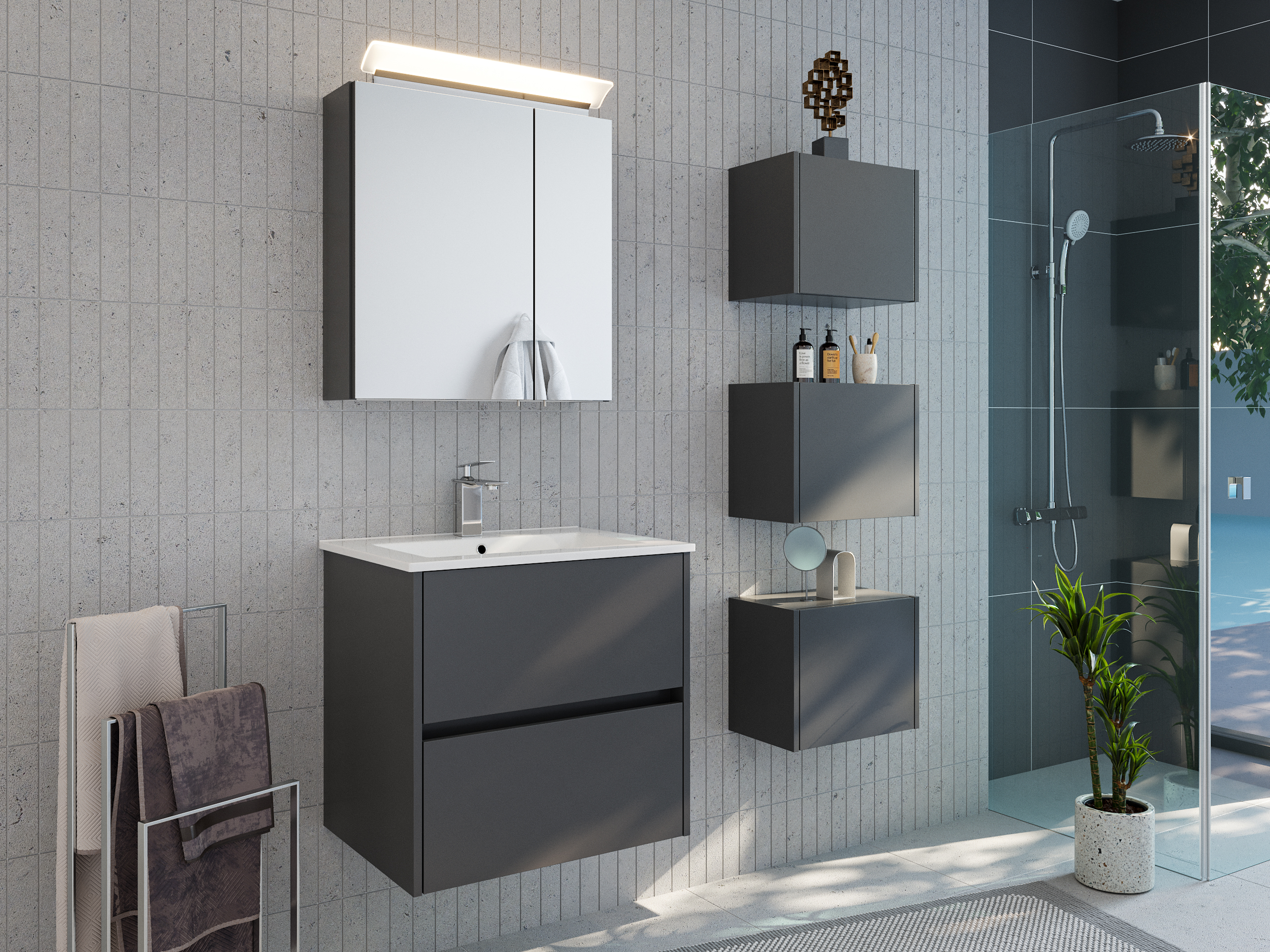Badmöbelset Taifun 60cm 3tlg mit Spiegelschrank & 3er Boxen Set grafit