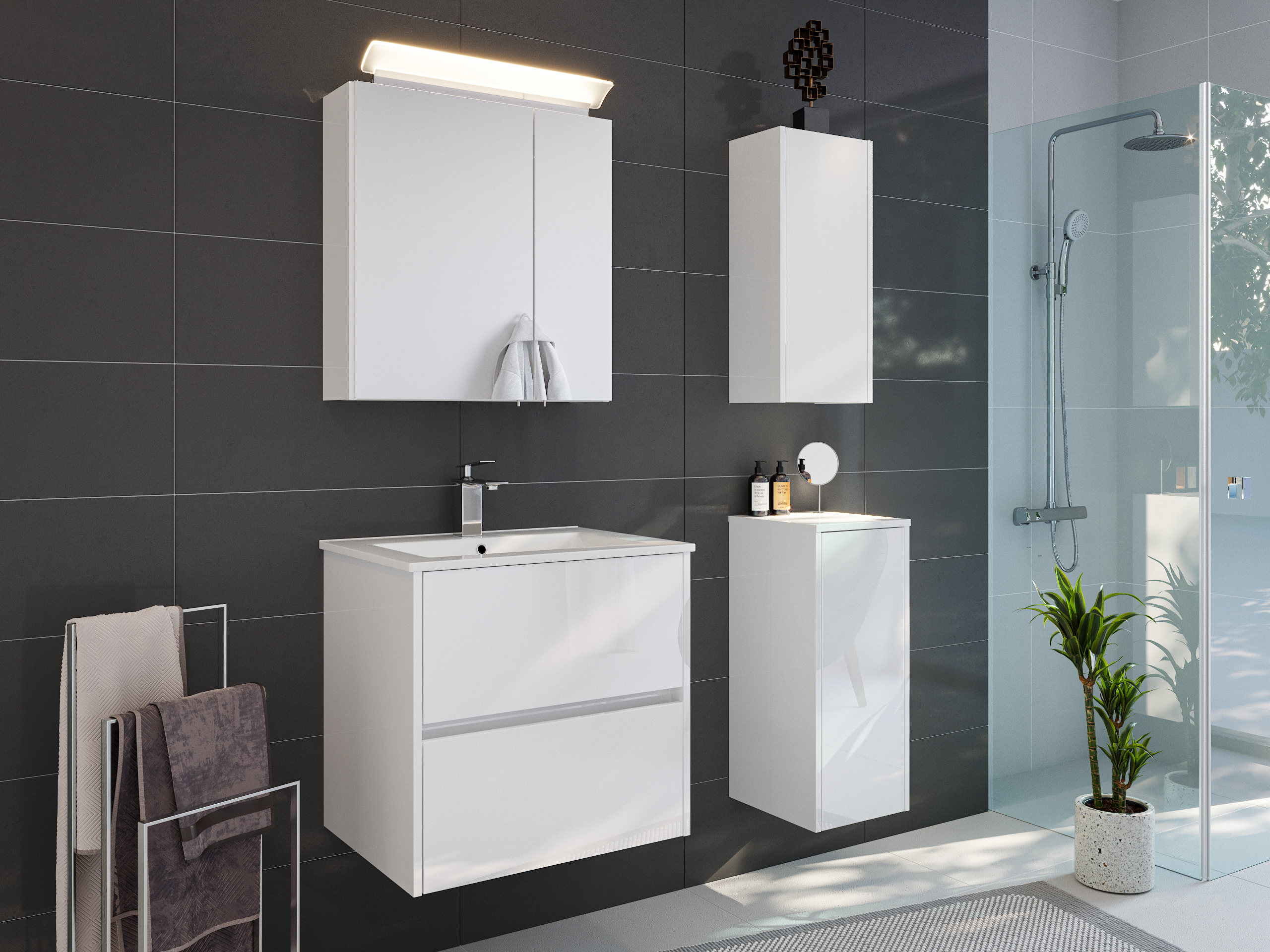 | Lieferumfang | Waschtischunterschrank, Waschbecken, Spiegelschrank, Seitenschrank, Montageanleitung |