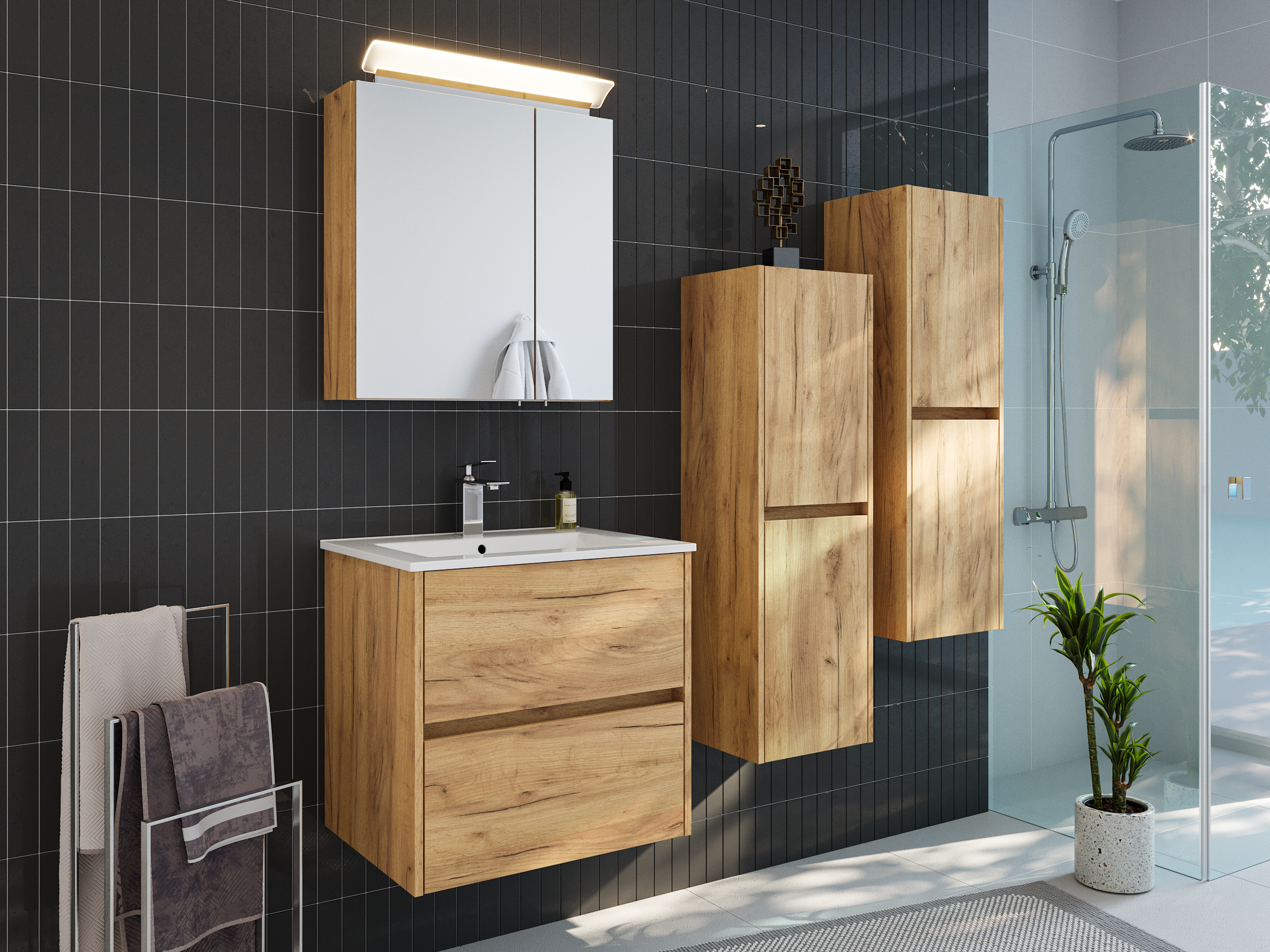 Badmöbelset Taifun 60cm 4tlg mit Spiegelschrank & 2x Seitenschrank eiche gold