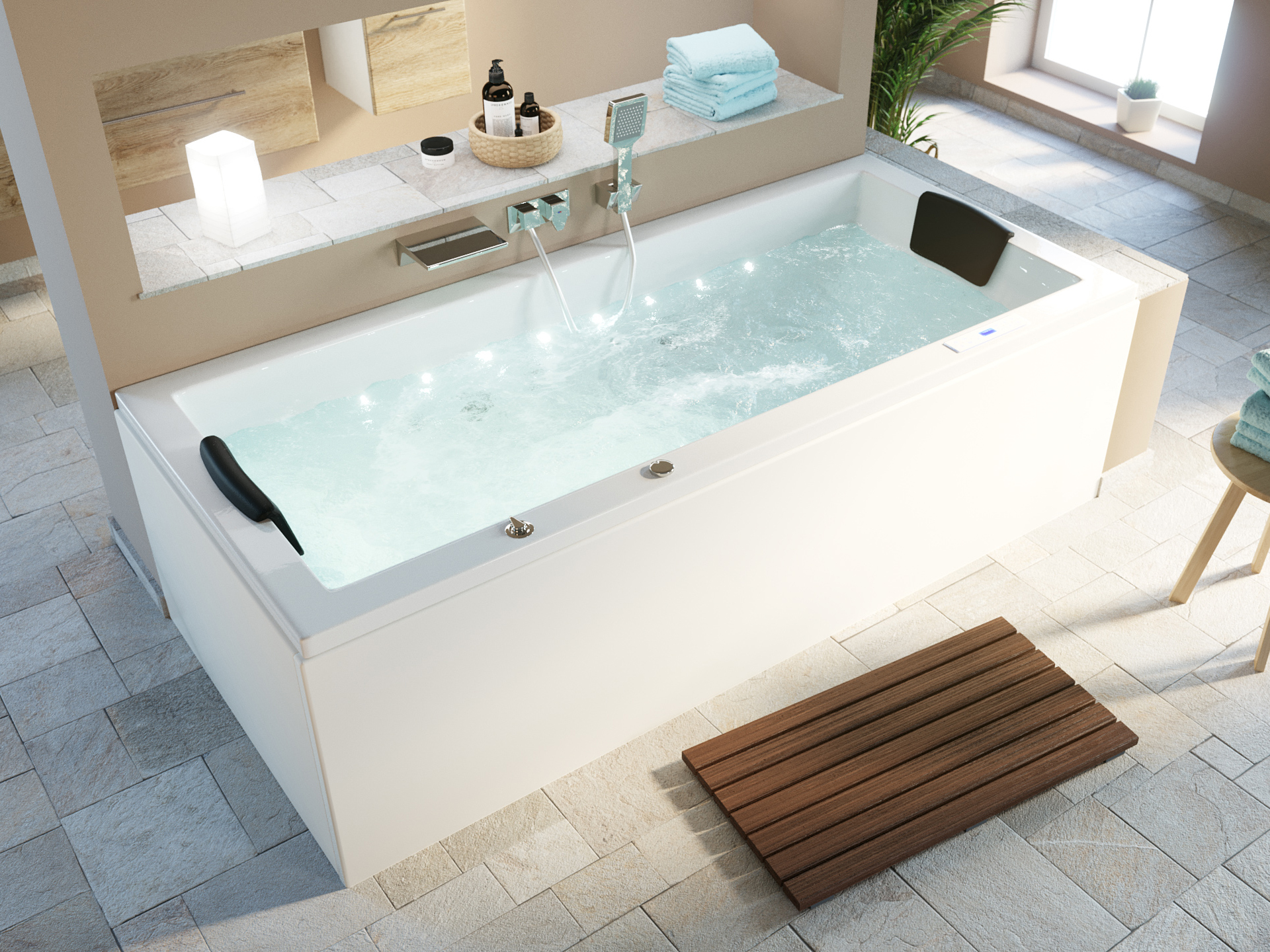- Anschlussfertige Whirlpool-Wanne (Made in Germany) mit Rahmen auf höhenverstellbaren Füßen.