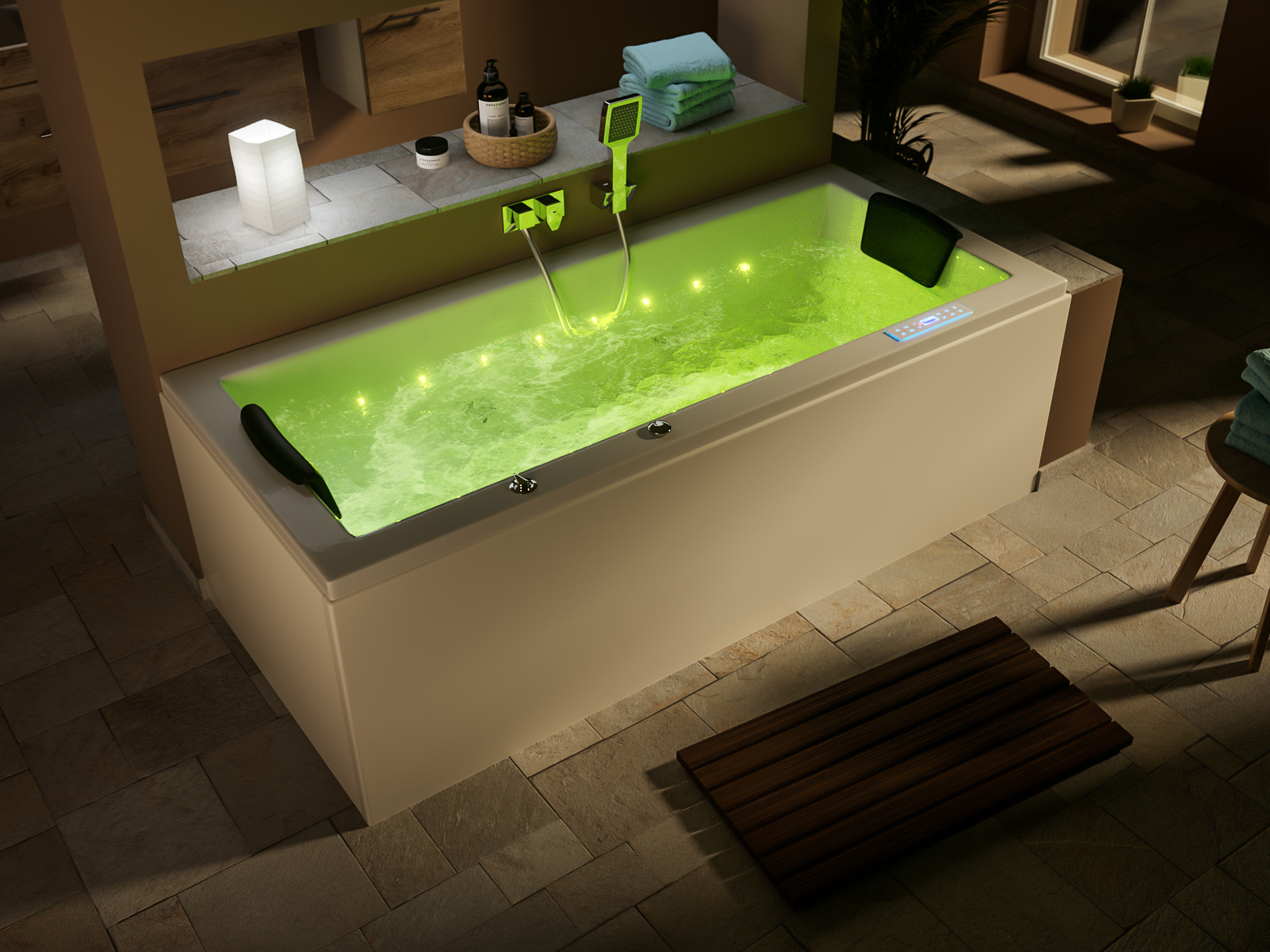 Entspanntes Baden mit Chromotherapie. Die Lichterketten jeweils auf beiden Seiten der Whirlwanne erleuchten das Wasser in allen Regenbogenfarben und bewirken eine sehr schöne Atmosphäre. Die Farben wechseln automatisch von Rot, Grün und Blau. Ganz einfach über das Bedienpanel die Wasserbeleuchtung anschalten.