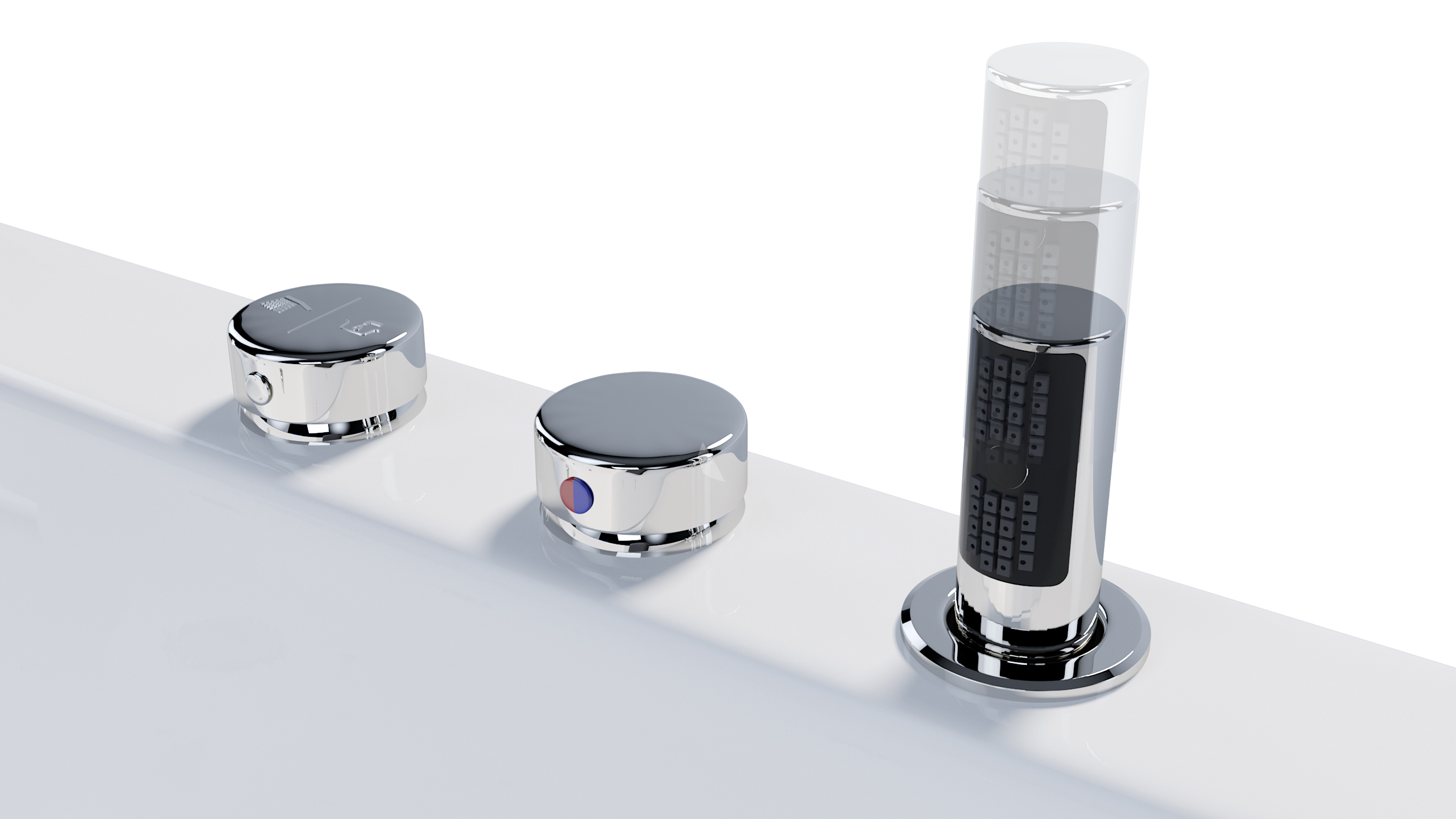 Zur Ausstattung des ULTRA-Whirlpools gehört die 2er-Armatur. Sie besteht aus zwei Drehkäufen, der eine mischt in einem Schalter das Kalt- und Warmwasser sowie die Wassermenge reguliert. Der andere Knauf ist ein Umschalter zur Handbrause bzw. zur Befüllung über den Überlauf.