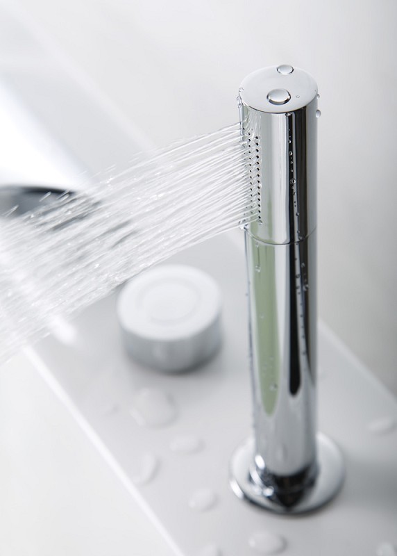 Zur kompletten Standard-Ausstattung gehören die 3er-Armatur (verchromte Messingarmatur mit Kunststoff-Kartusche), die Standard-Handbrause sowie der Wasserfall.