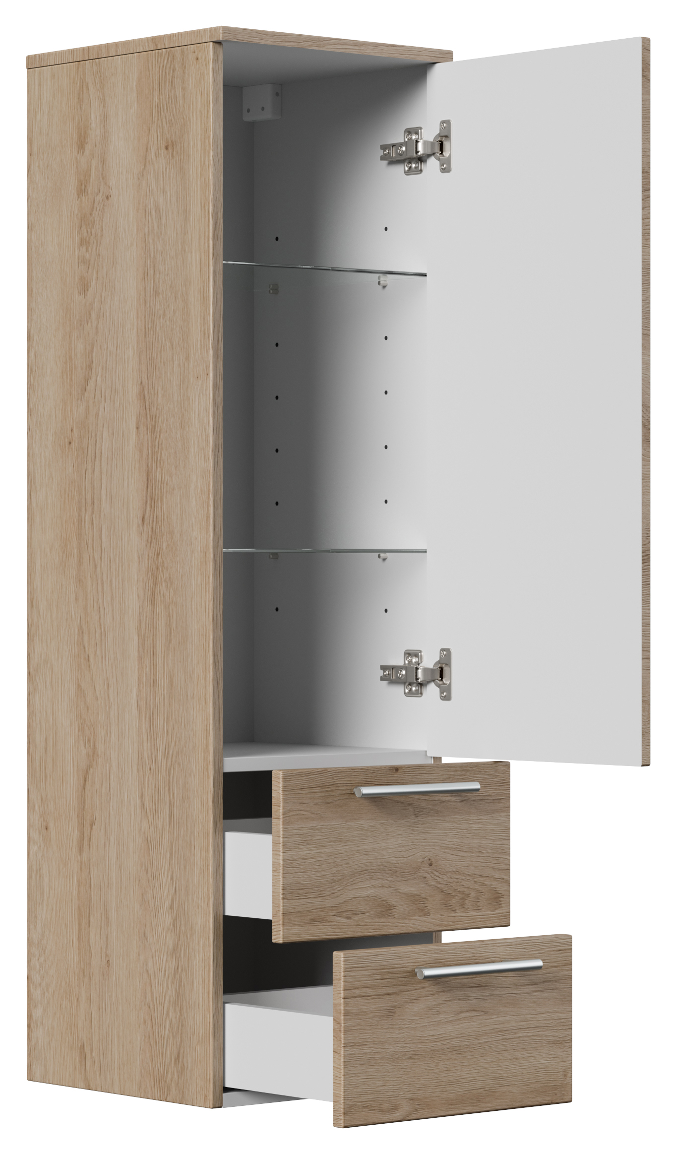 Badhochschrank 120 (2 Softclose-Schubladen, 2 Regalböden, 2 Glasböden, Soft-Close-Tür).