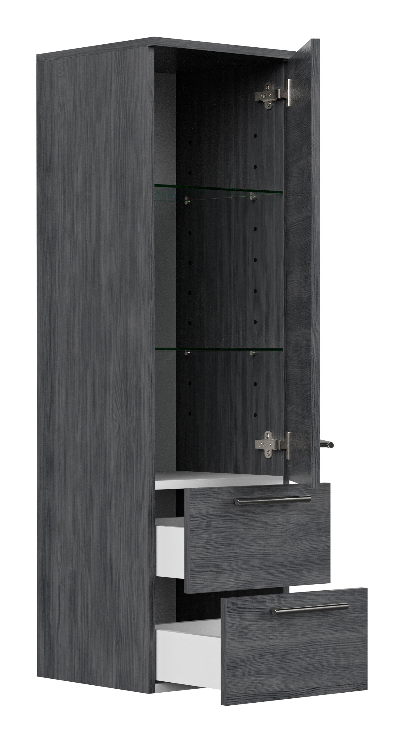 Badhochschrank 120 (2 Softclose-Schubladen, 2 Regalböden, 2 Glasböden, Soft-Close-Tür).