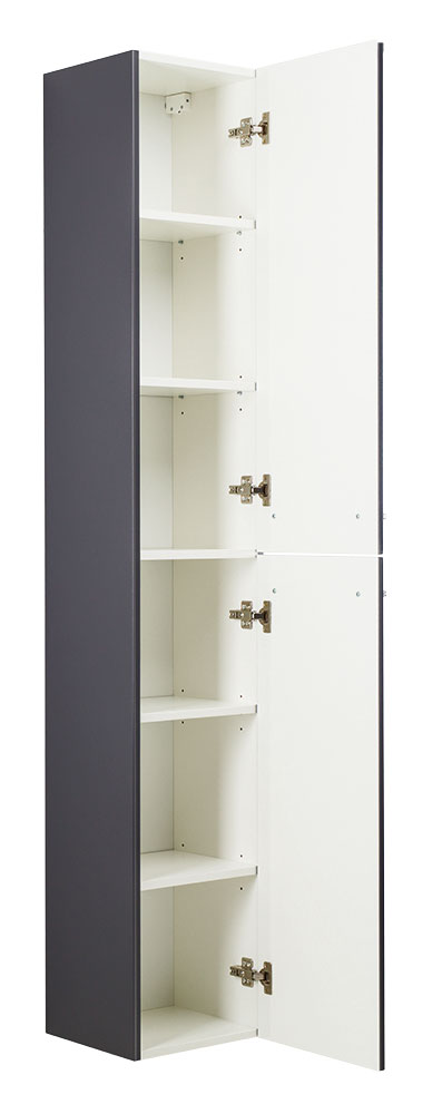 In der dunklen Farbgebung anthrazit passt der Hochschrank 188 cm vor allem in edel eingerichtete Badezimmer, die möglicherweise schon durch andere Badmöbel unseres Angebots in diesem Farbton eingerichtet wurden. Viel Platz bietet der Badezimmerschrank durch zwei Türen, die insgesamt vier Einlegeböden preisgeben. Bitte beachten Sie, dass der Deckel in weiß gehalten ist. Montage ist sowohl mit Rechts- als auch Linksanschlag möglich.