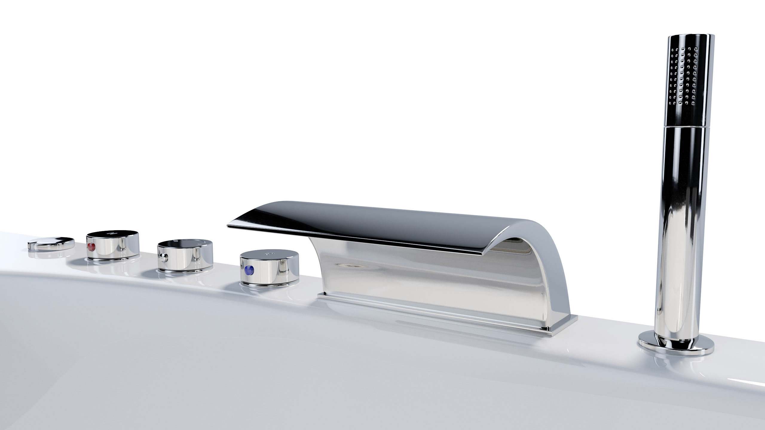 Zur kompletten Standard-Ausstattung gehören die 3er-Armatur (verchromte Messingarmatur mit Kunststoff-Kartusche), die Standard-Handbrause sowie der Wasserfall.