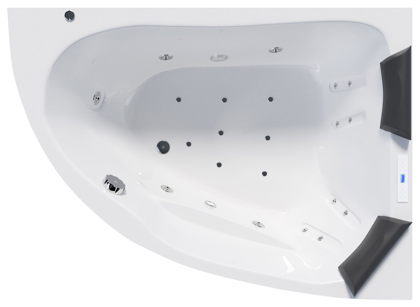 Vorteile: Flatjet-Düse liegt nahezu bündig auf der Whirlpoolinnenfläche (Flatline) Hochwertiger Düsenkörper des Flatjets: aus einem massiven Messingblock gefräst, dann verchromt.STANDARD-Ausstattung: Rückenmassagedüsen