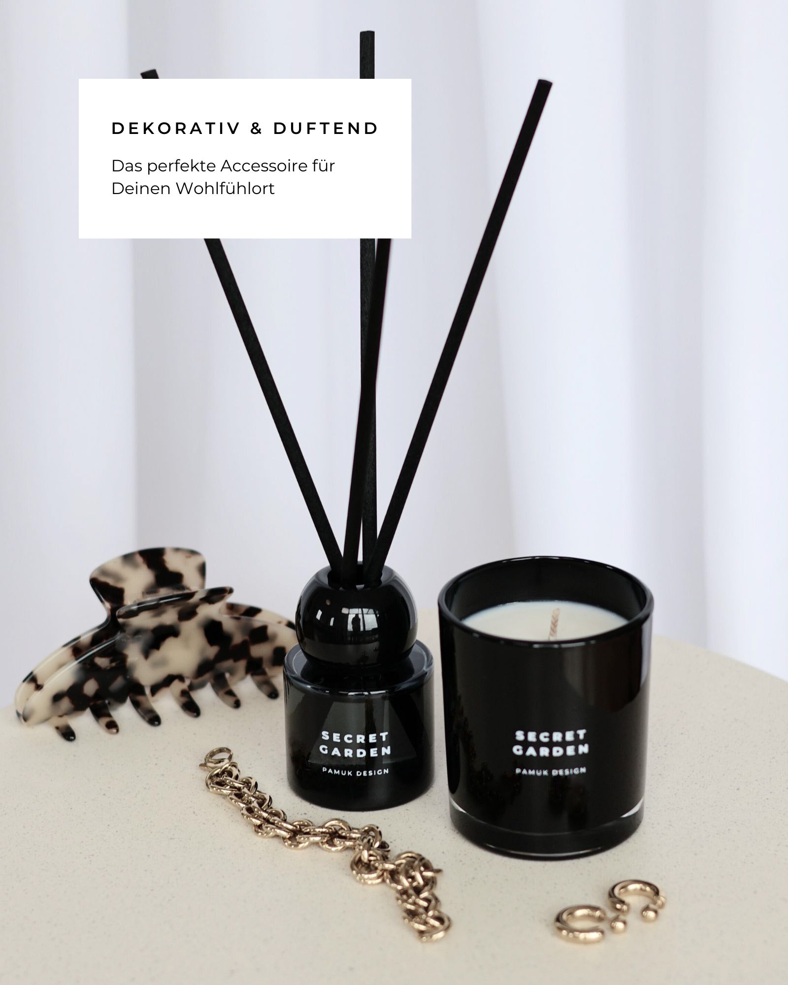 Das elegante schwarze Design verbindet luxuriöse Duftkompositionen mit minimalistischer Ästhetik und setzt stilvolle Akzente in jedem Raum. Die feinen Duftnoten von spritziger Grapefruit, roter Orange und duftenden Rosenblüten entfalten sich dezent und sorgen für eine langanhaltende, blumig-frische Atmosphäre – wie ein Spaziergang durch einen sonnendurchfluteten Garten im Süden. Genieße mit SECRET GARDEN jeden Tag neue Frische, Inspiration und mediterrane Lebensfreude – für Deine persönliche Auszeit, wann immer Du möchtest.