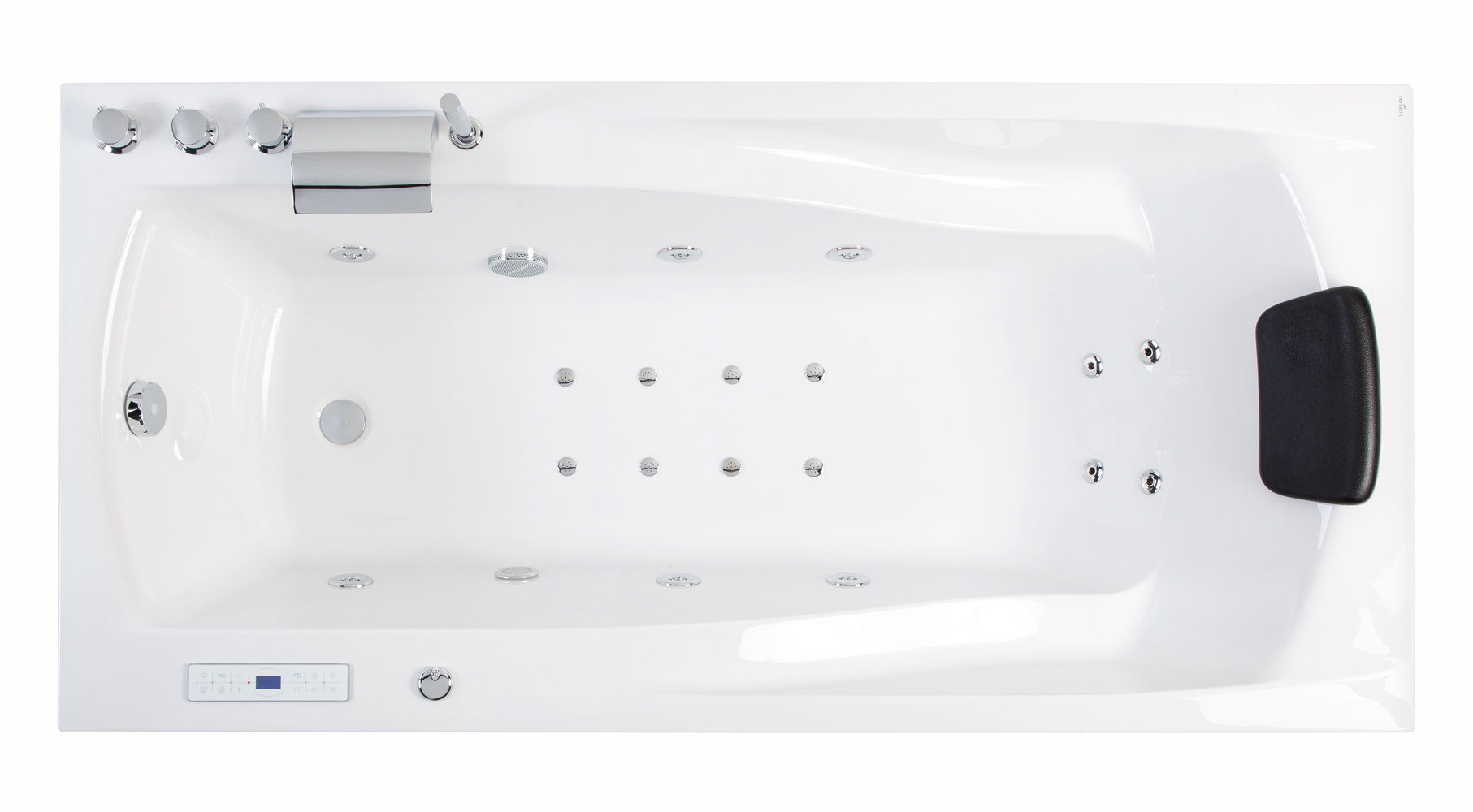 6 Stk. große Seitendüsen Hydrojets Hydromassage, 1x4 Stk. große Düsen Hydrojets Hydromassage im Rückenbereich, 8 Stk. Bodenluftdüsen Aerojets (Prickelnder Sprudel-Effekt).Material: Wanne aus Sanitäracryl auf stabilem Rahmen mit höhenverstellbaren Füßen.