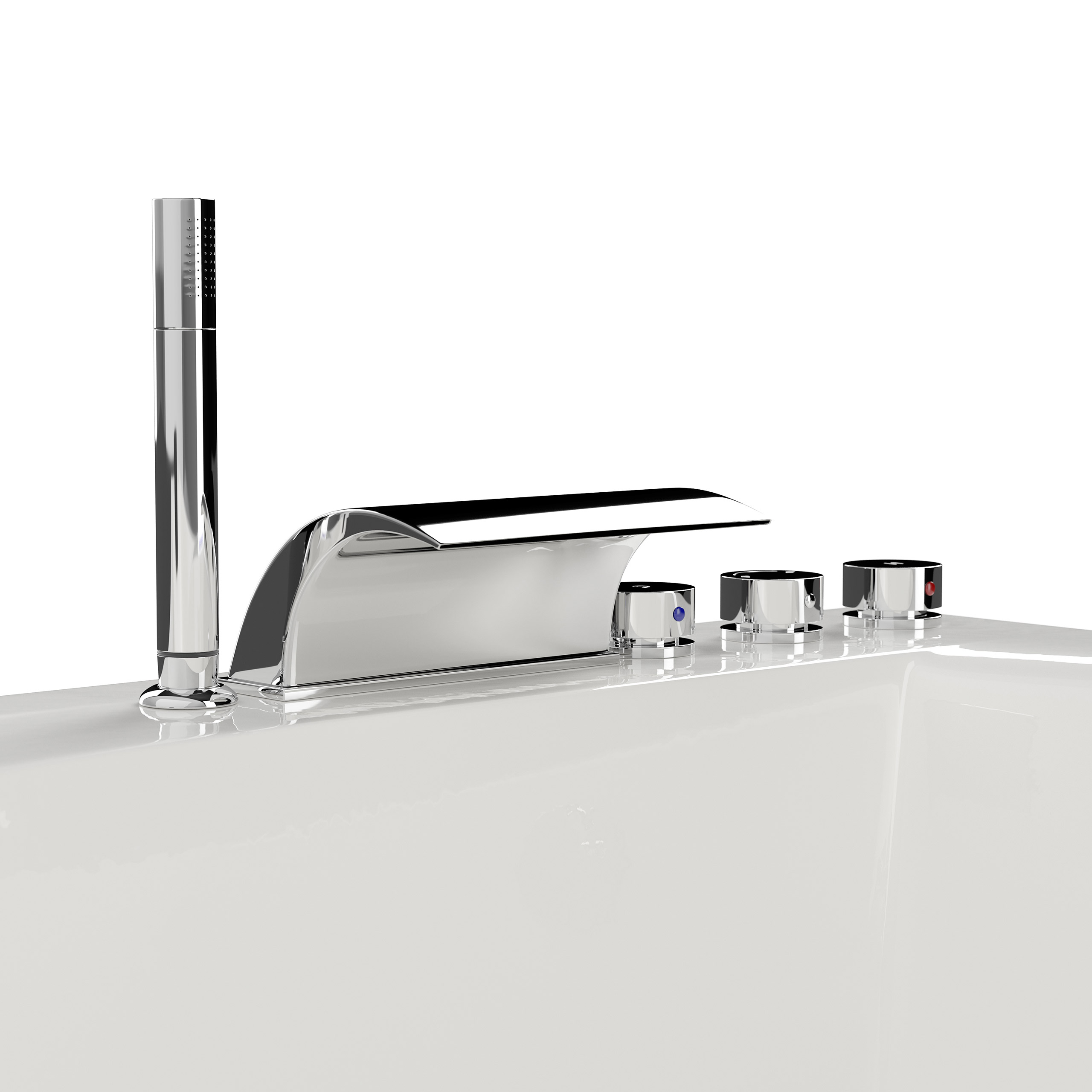 Zur kompletten Standard-Ausstattung gehören die 3er-Armatur (verchromte Messingarmatur mit Kunststoff-Kartusche), die Standard-Handbrause sowie der Wasserfall.