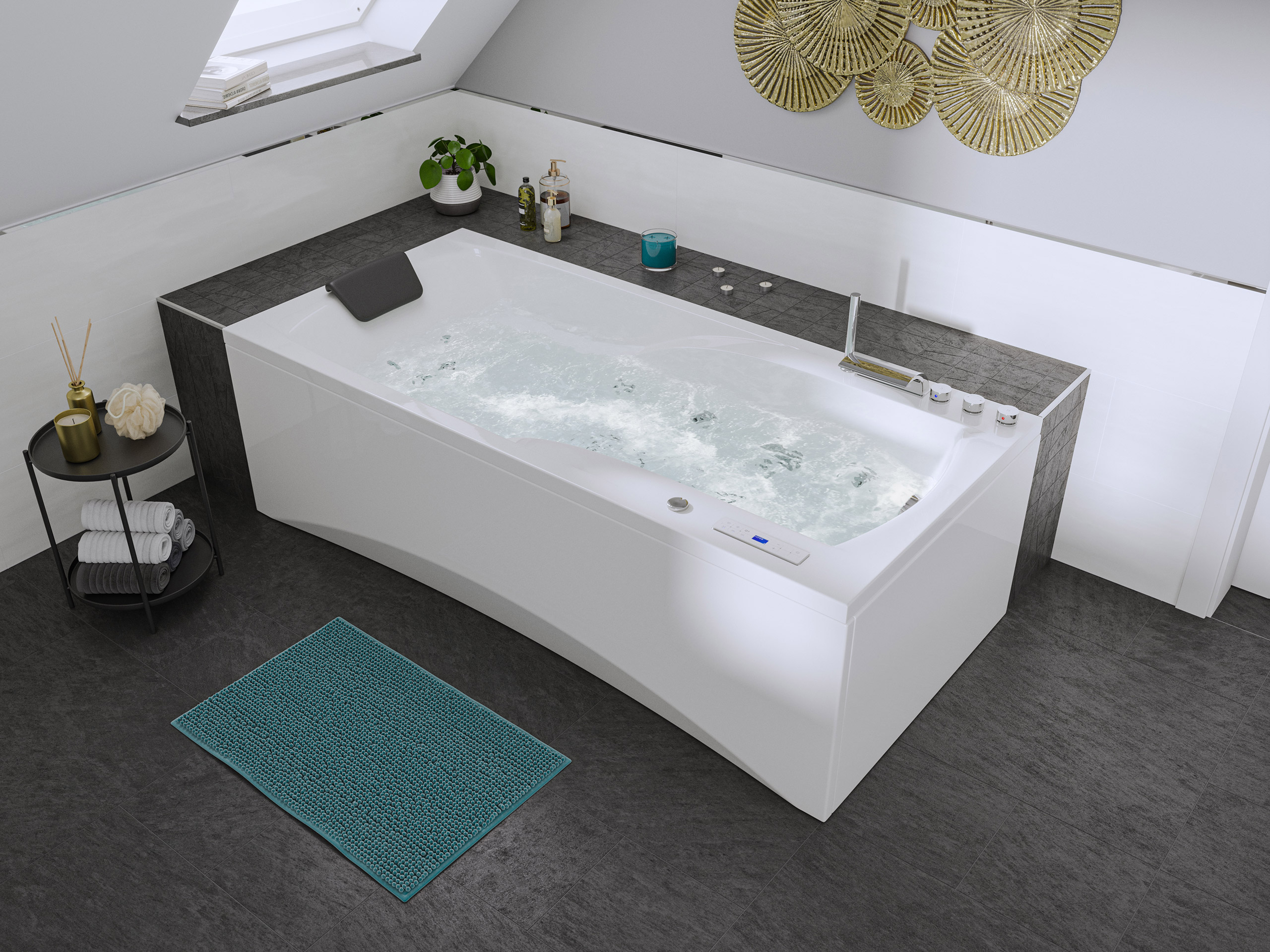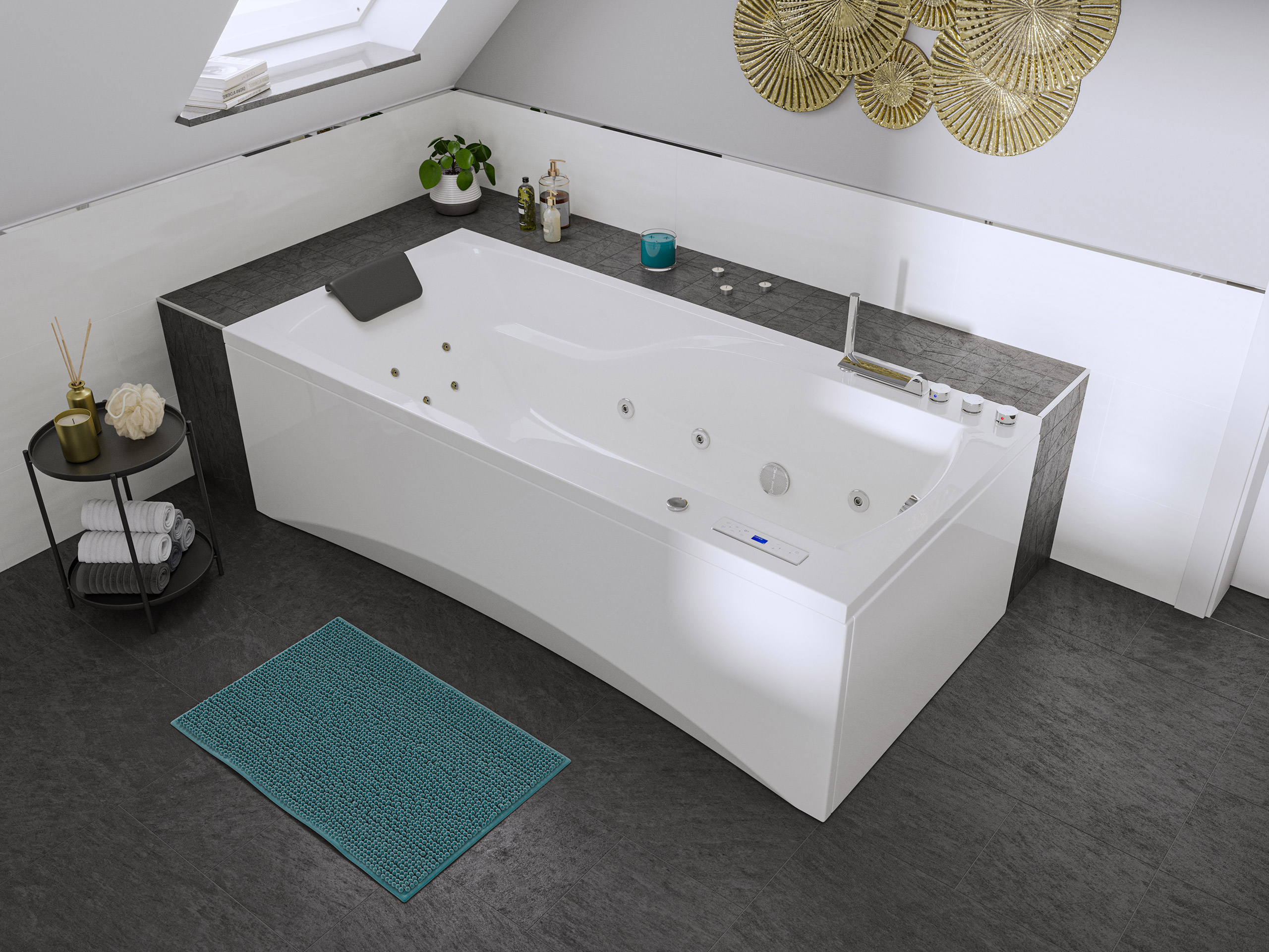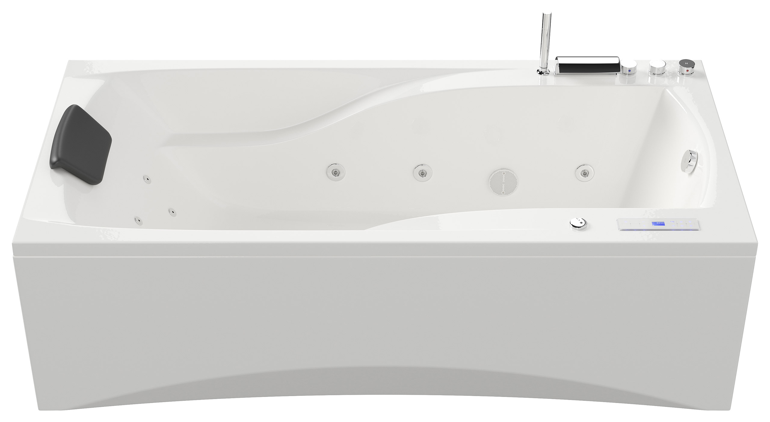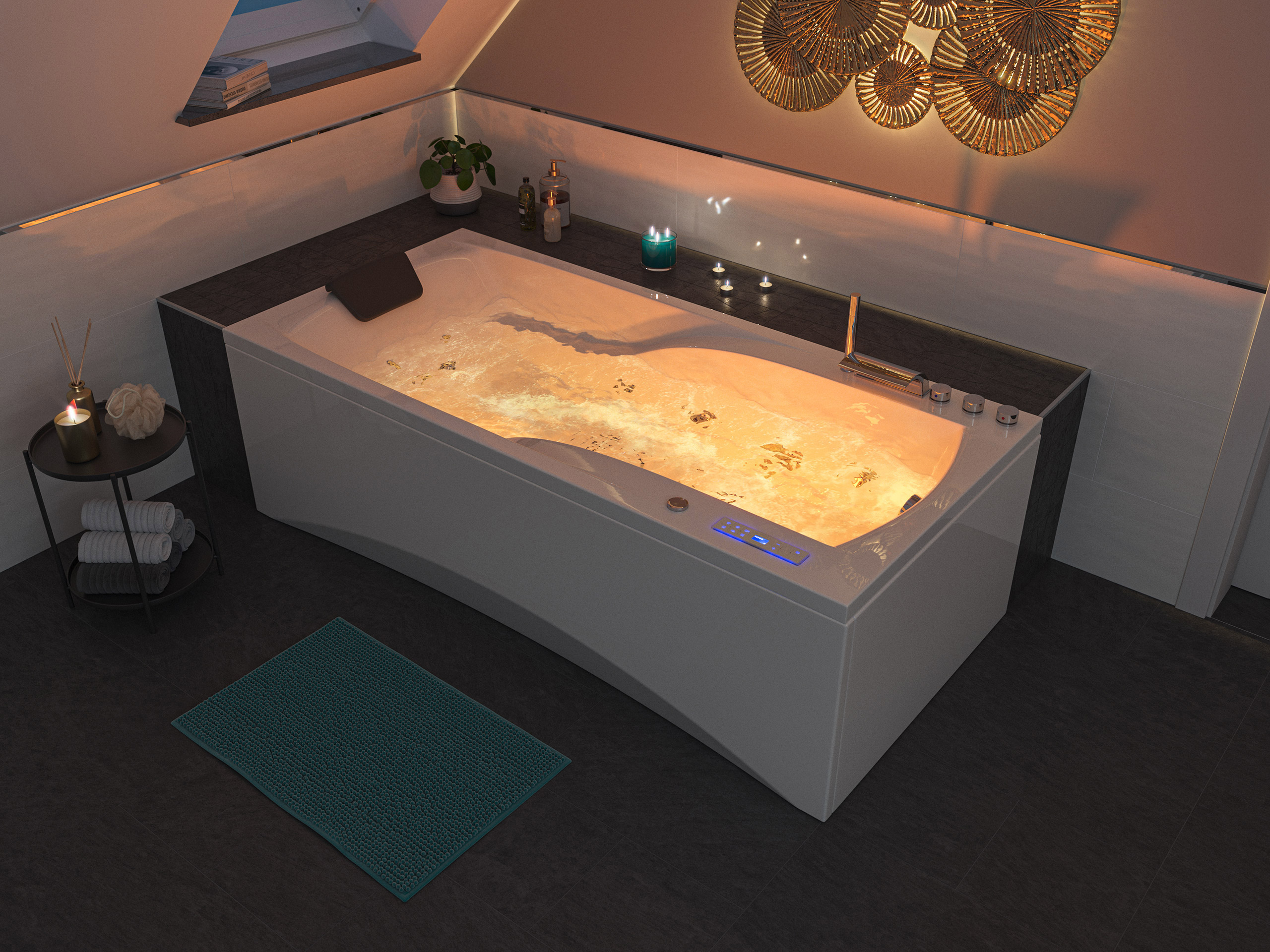 Vorteile: Dezente Strahler seitlich. Automatischer Farbwechsel mit gleichmäßiger Wasserbeleuchtung. Intensive Farben leuchten unter Wasser. Entspanntes Baden mit Chromotherapie.Massagefunktion: Düsen-Ausstattung