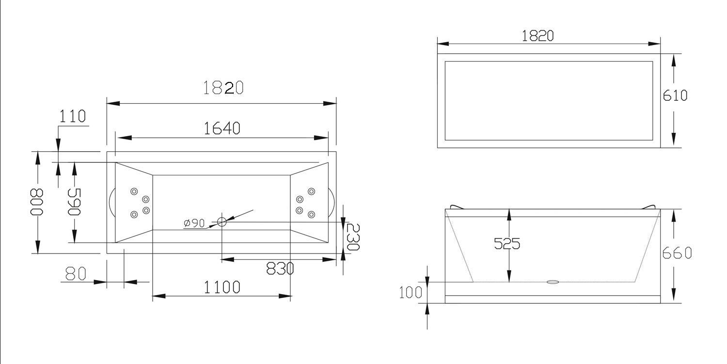 4 Stk. große Seitendüsen Hydrojets Hydromassage, 2x4 Stk. große Düsen Hydrojets Hydromassage im Rückenbereich, 8 Stk. Bodenluftdüsen Aerojets (Prickelnder Sprudel-Effekt).Material: Wanne aus Sanitäracryl auf stabilem Rahmen mit höhenverstellbaren Füßen.