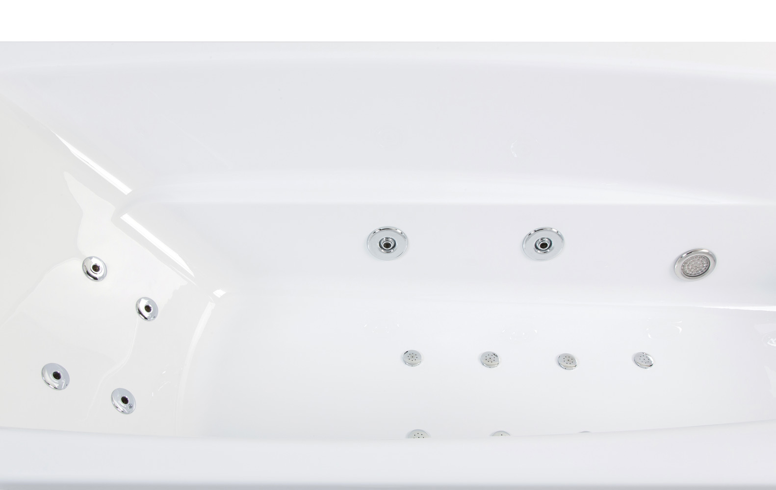 Vorteile: Flatjet-Düse liegt nahezu bündig auf der Whirlpoolinnenfläche (Flatline) Hochwertiger Düsenkörper des Flatjets: aus einem massiven Messingblock gefräst, dann verchromt.STANDARD-Ausstattung: Rückenmassagedüsen
