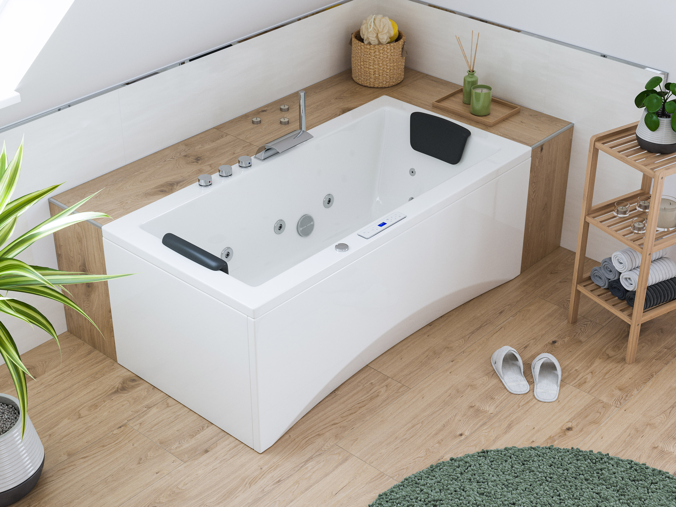 - Anschlussfertige Whirlpool-Wanne (Made in Germany) mit Rahmen auf höhenverstellbaren Füßen.