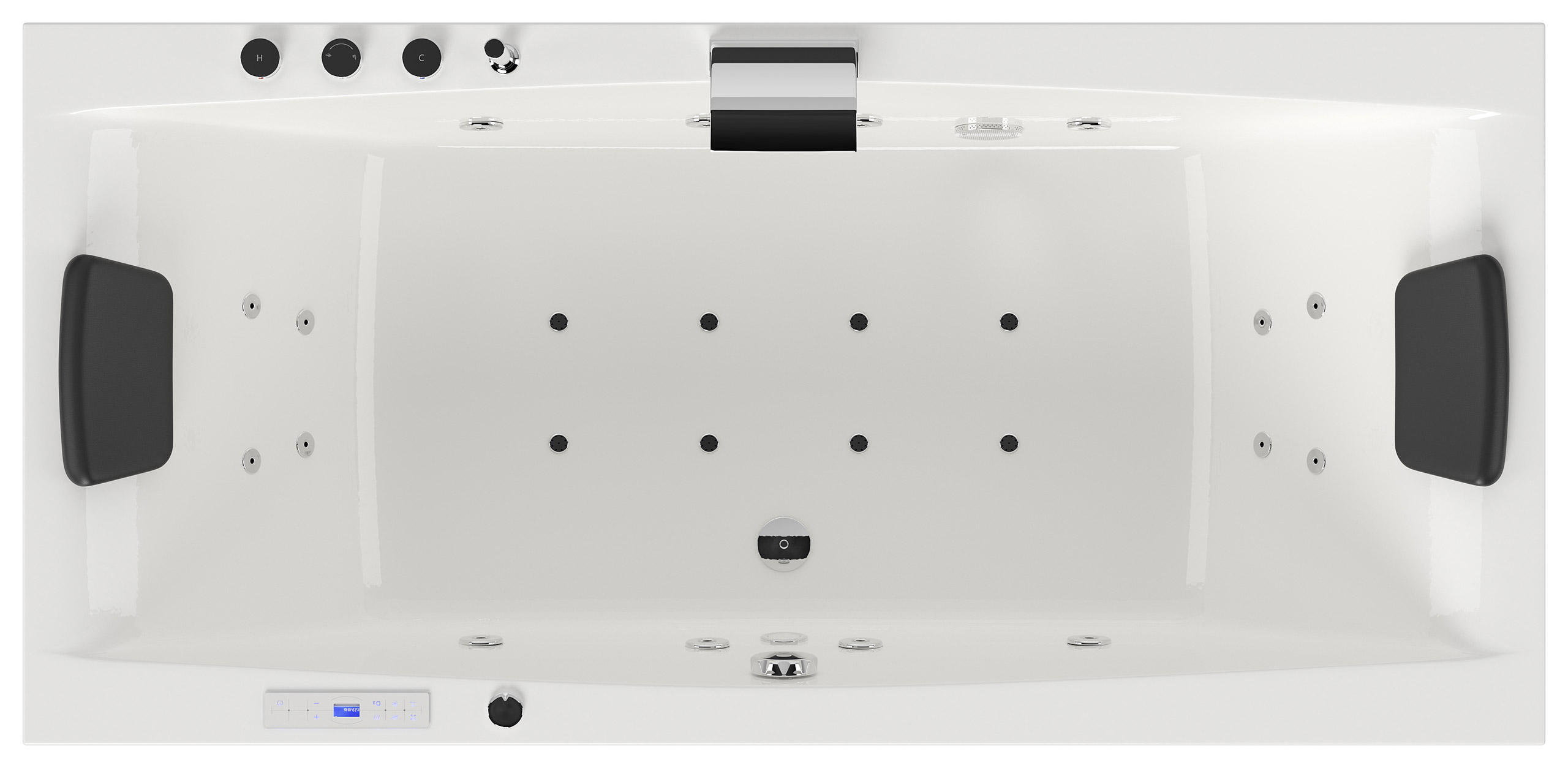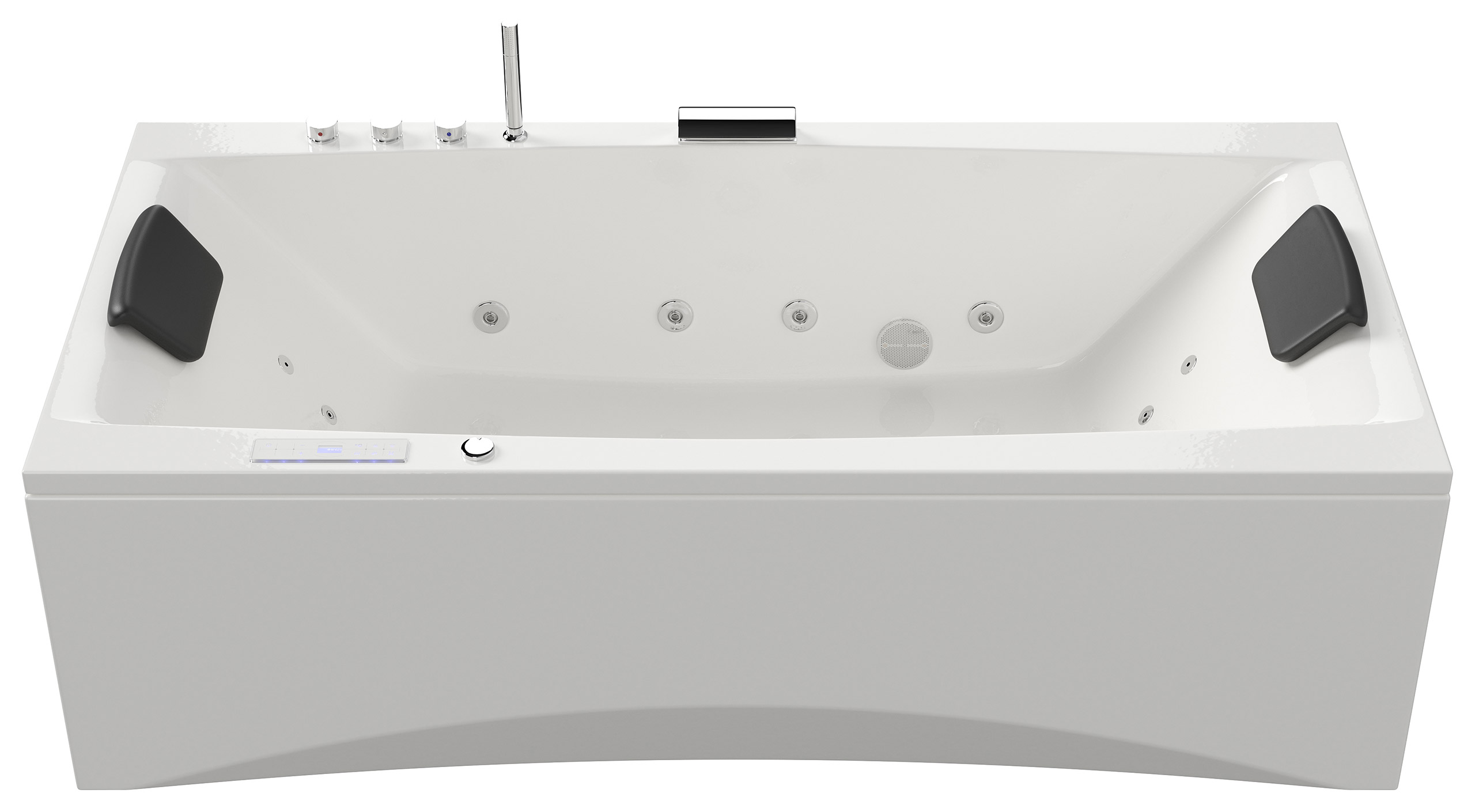 Vorteile: Dezente Strahler seitlich. Automatischer Farbwechsel mit gleichmäßiger Wasserbeleuchtung. Intensive Farben leuchten unter Wasser. Entspanntes Baden mit Chromotherapie.Massagefunktion: Düsen-Ausstattung
