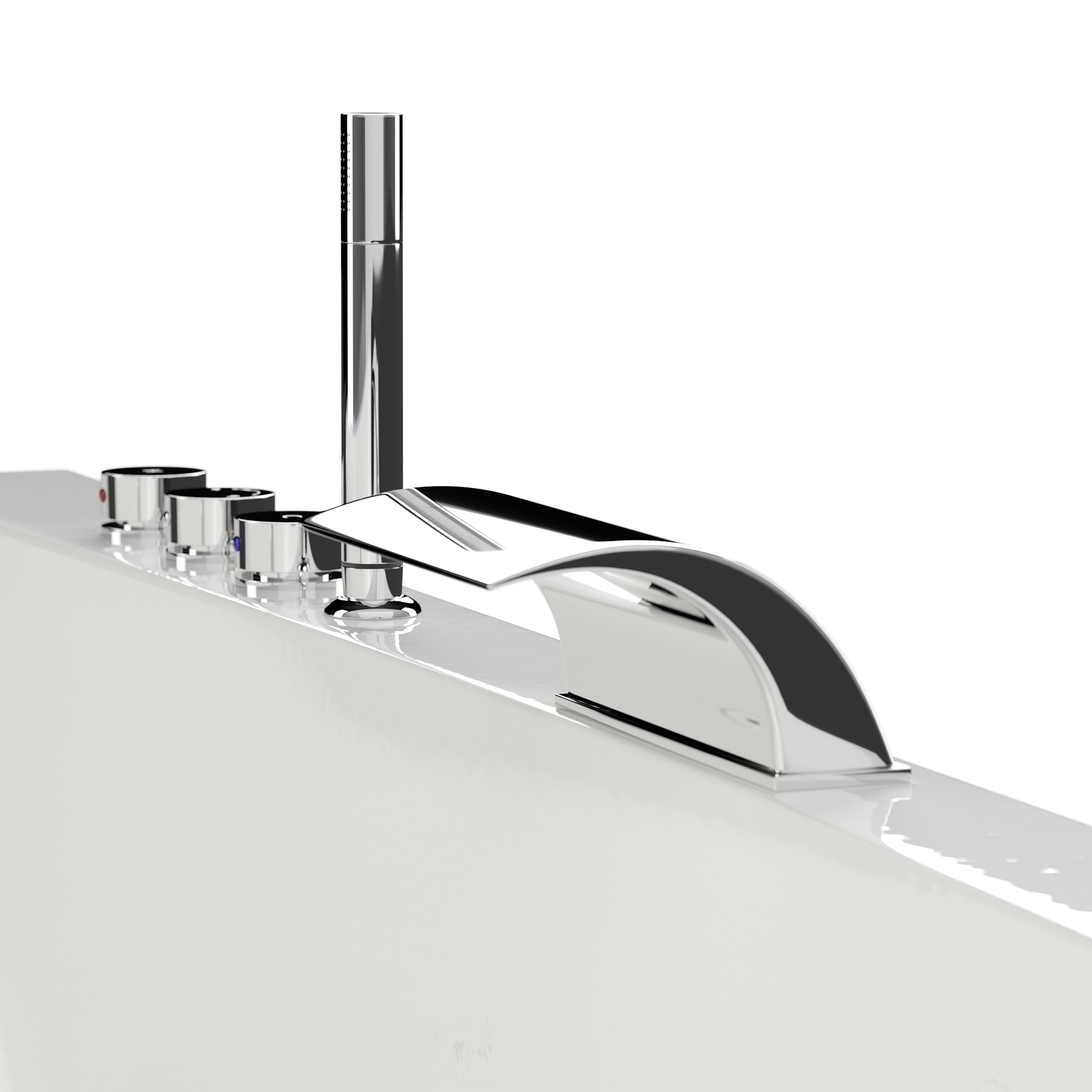 Zur kompletten Standard-Ausstattung gehören die 3er-Armatur (verchromte Messingarmatur mit Kunststoff-Kartusche), die Standard-Handbrause sowie der Wasserfall.