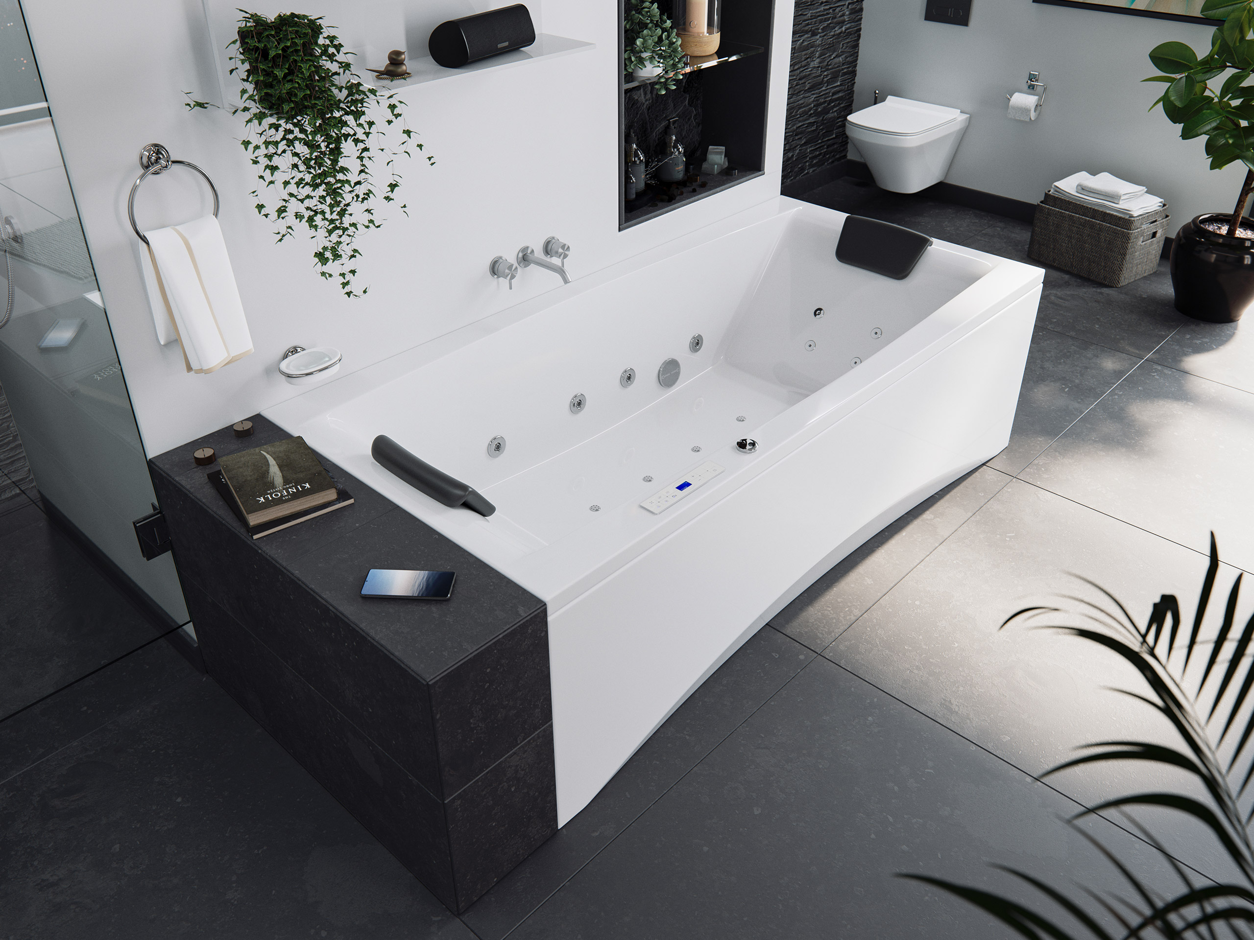 - Anschlussfertige Whirlpool-Wanne (Made in Germany) mit Rahmen auf höhenverstellbaren Füßen.