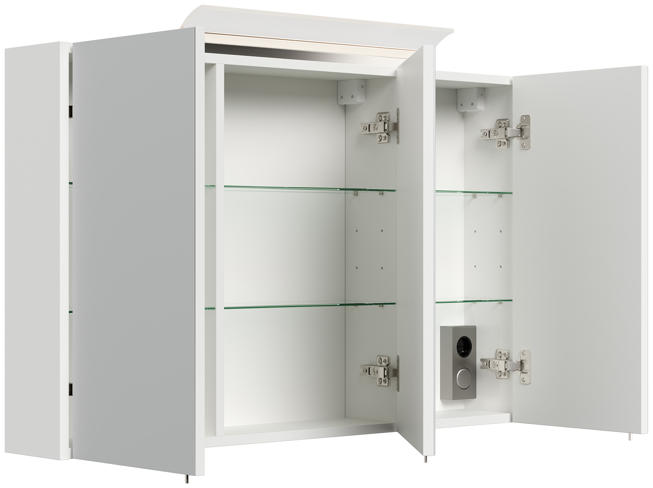 | Lieferumfang | 1x Spiegelschrank, LED-Acrylglaslampe auf Spiegelschrank, Kombibox im Spiegelschrank mit Lichtschalter und Stromanschluss |