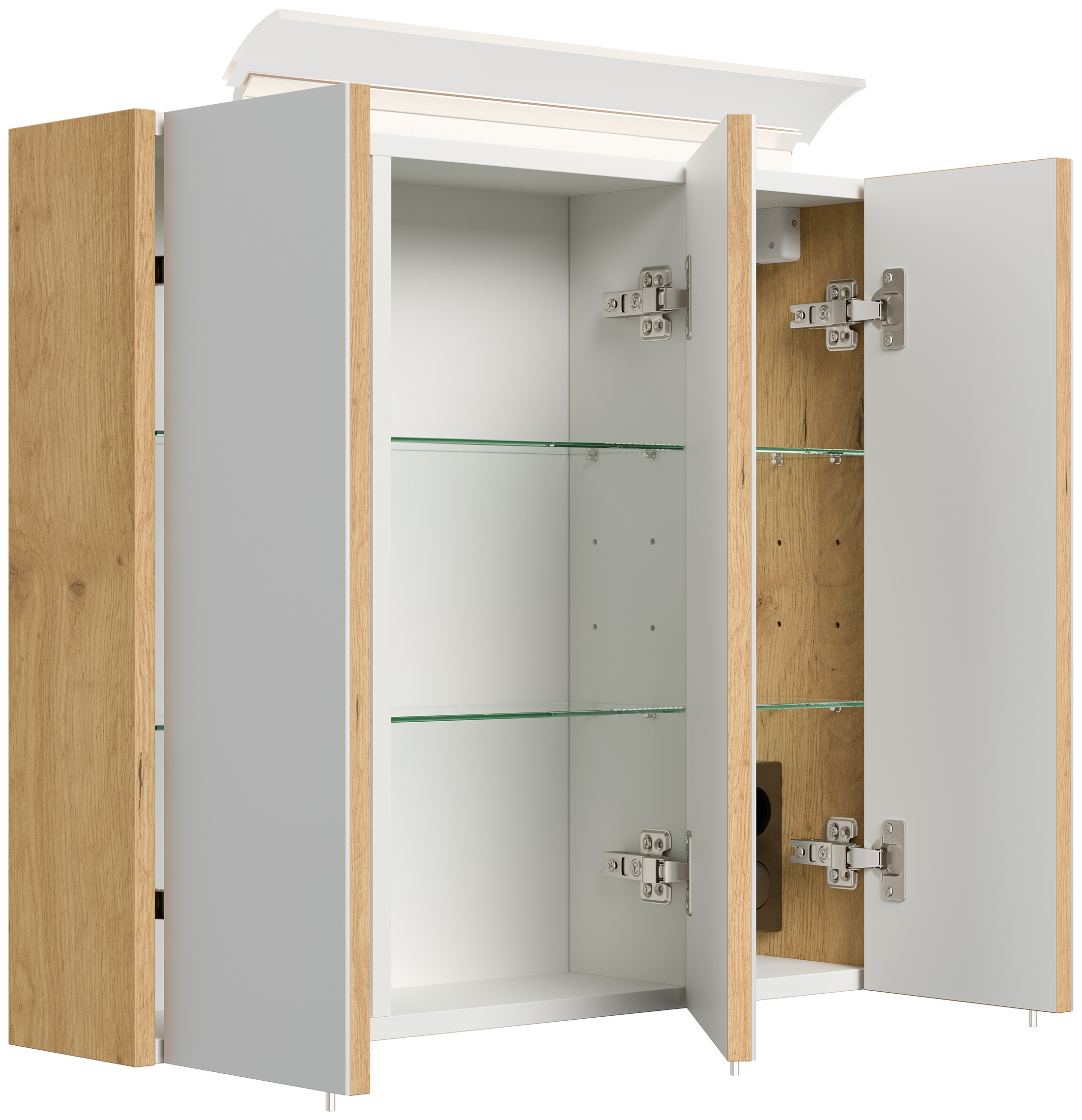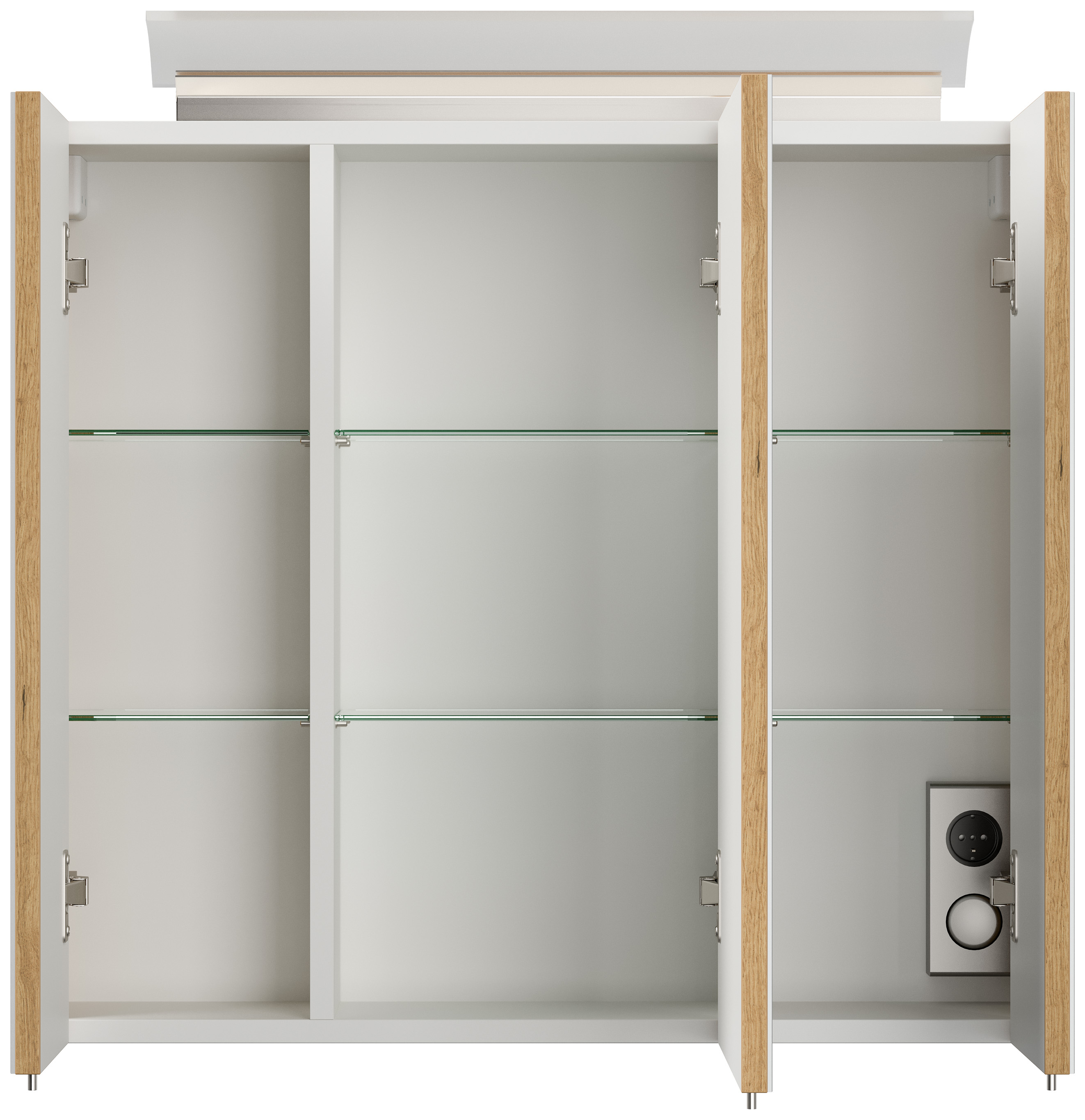 | Lieferumfang | 1x Spiegelschrank, LED-Acrylglaslampe auf Spiegelschrank, Kombibox im Spiegelschrank mit Lichtschalter und Stromanschluss |