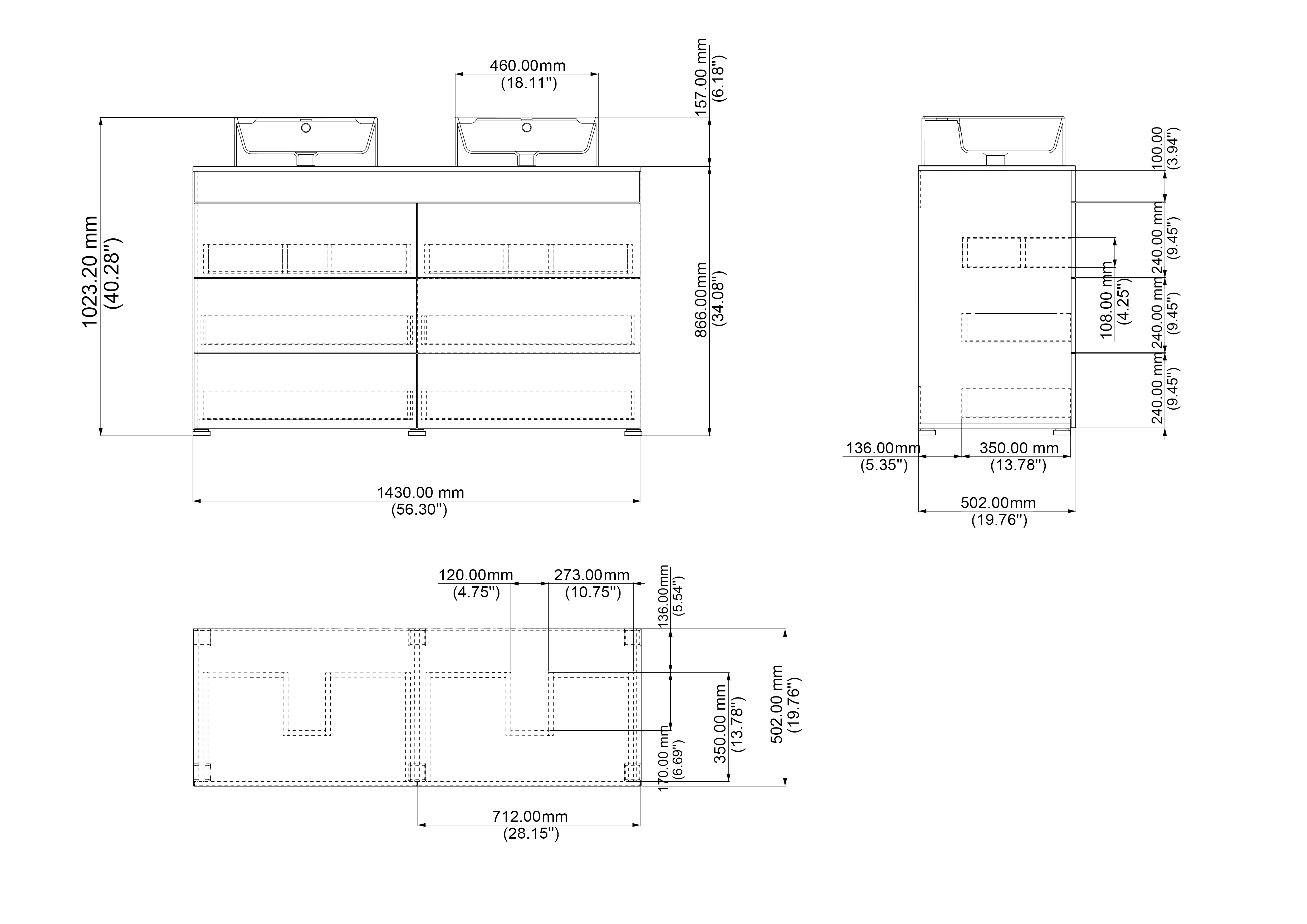 Badmöbel inkl. Waschbecken (B/H/T) 143/104,7/48,6 cm,Waschtischunterschrank ohne Becken/Füße (B/H/T) 143/84,6/48,6 cm,