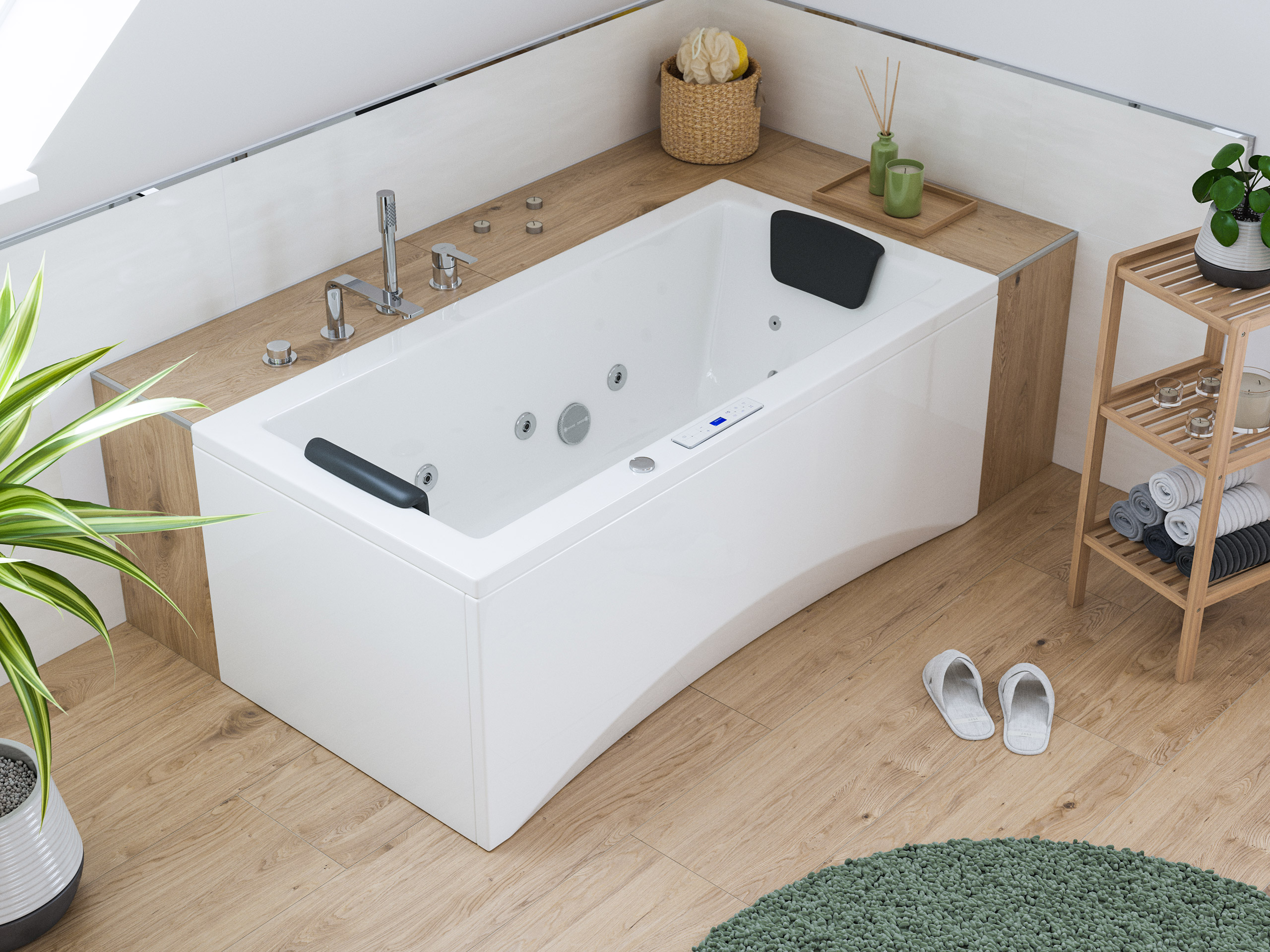 | Lieferumfang | Whirlpool-Wanne, 12 V LED-Beleuchtung, Luftbeimischventil, Ab- und Überlauf |