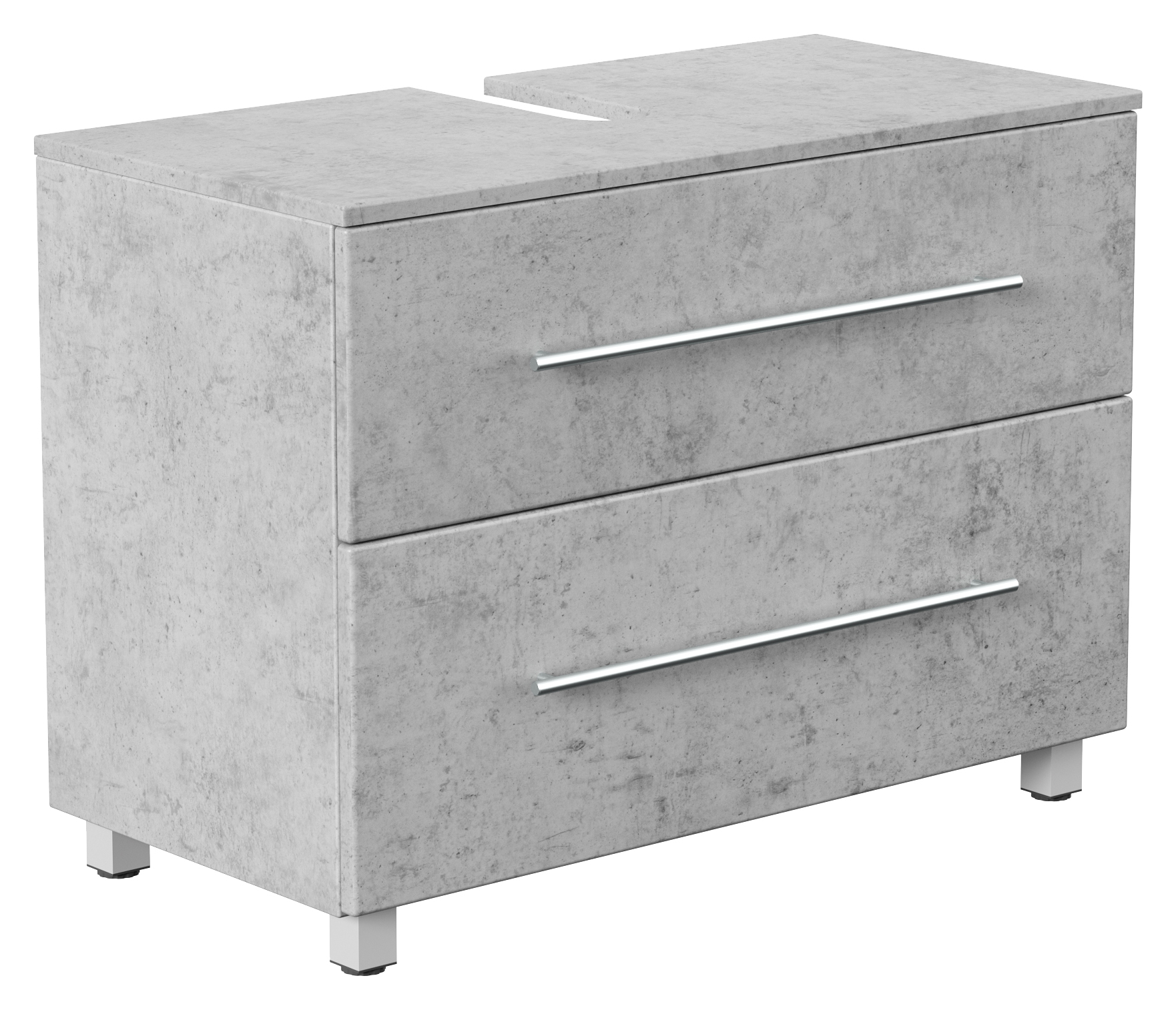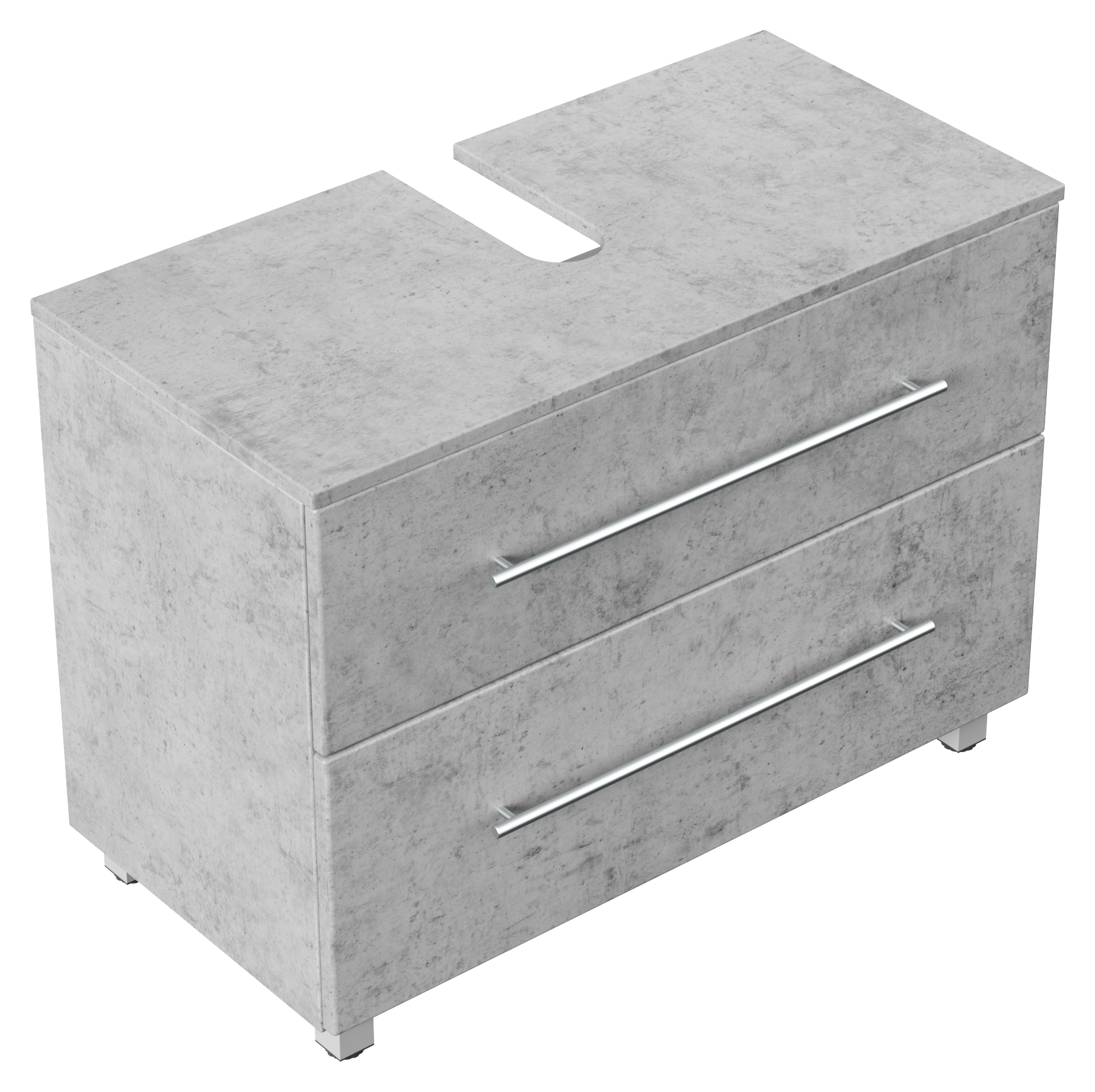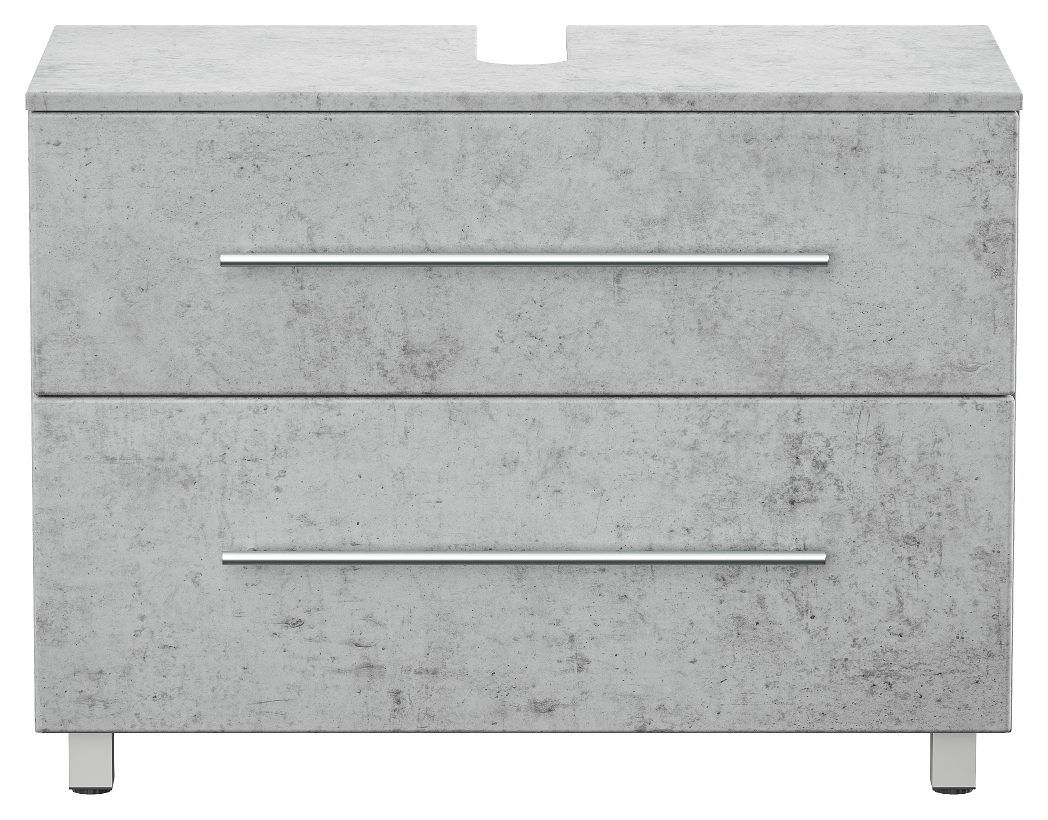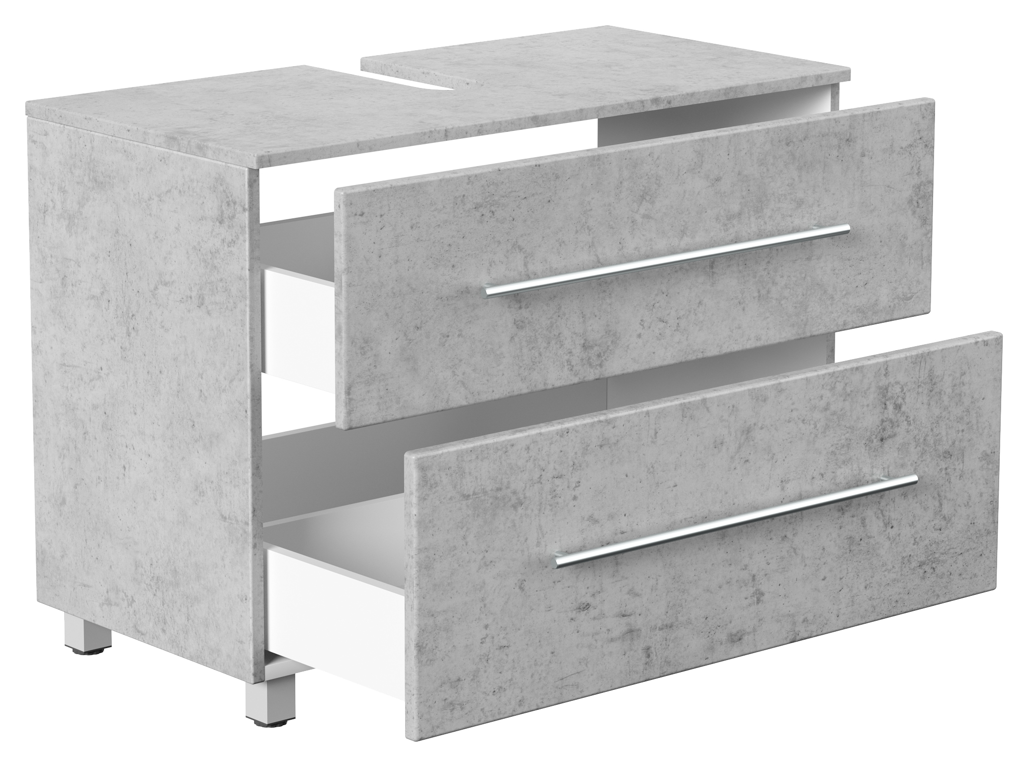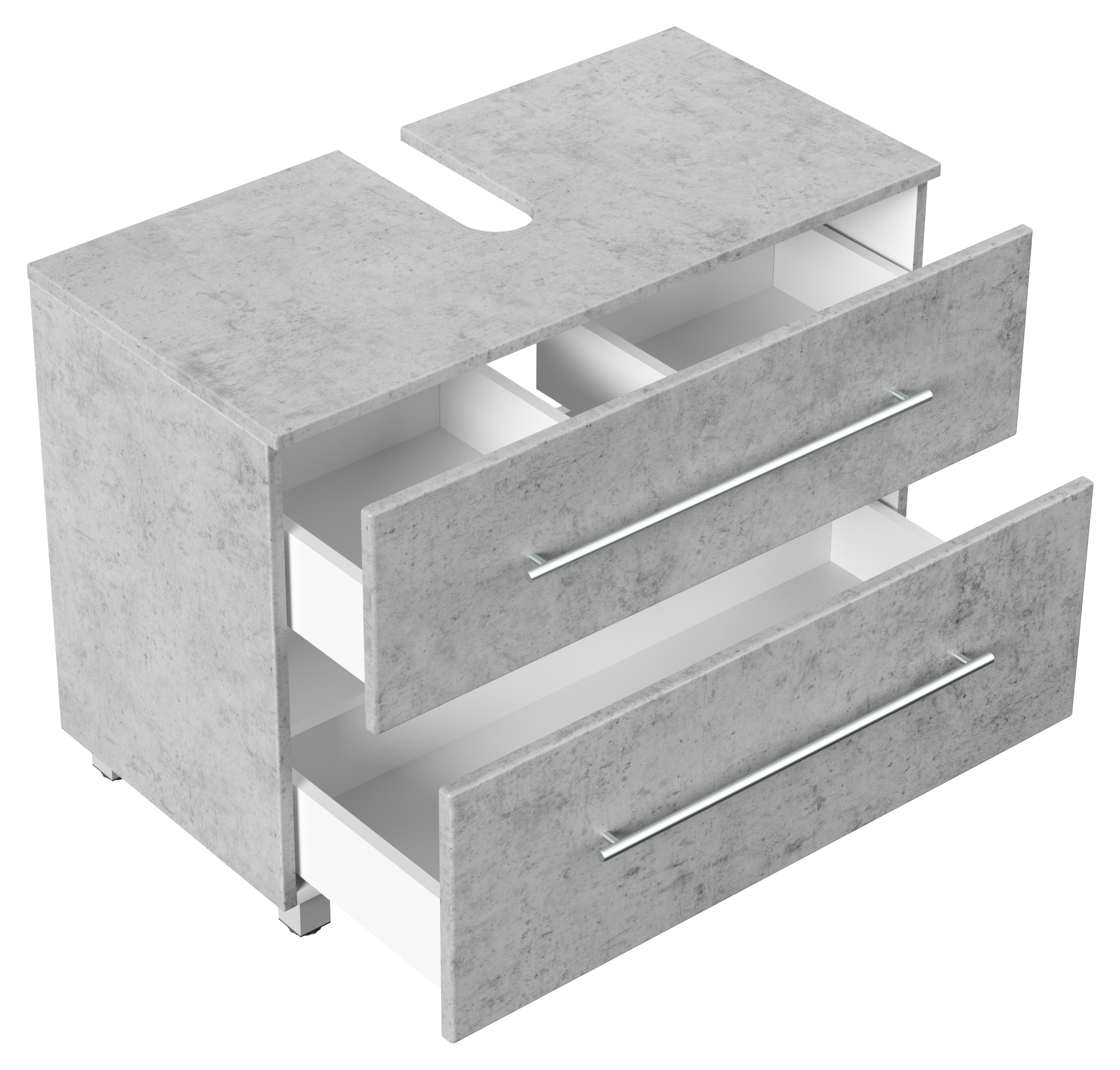 Ihr Waschbecken verwandelt sich in ein attraktives Badmöbel mit diesem Universal Unterbau. Der 85 cm breite Waschbeckenunterschrank mit den Oberflächen in der Farbe Beton wurde für Waschbecken bis zu 100 cm Breite entworfen. Ihr Bad wirkt mit diesem Waschtischunterschrank sofort eleganter. Sie stellen - ohne sanitärtechnische Vorarbeiten - den Waschtischunterschrank unter Ihr Waschbecken - fertig!Der Waschbeckenunterschrank besitzt zwei Schubladen mit extra breiten Griffen aus gebürstetem Edelstahl. Das komfortable Soft-Close-System garantiert selbsttätiges, weiches Schließen der Schubfächer und gestattet deren Vollauszug. Sie werden die größere Übersicht in Ihrem Waschbeckenunterschrank schnell zu schätzen wissen. Das Badmöbel ohne Waschbecken wird als Universal Unterbau in zerlegter Form geliefert. Gestalten Sie Ihr Bad mit wenig Aufwand neu - machen Sie mit diesem Waschbeckenunterschrank aus Ihrem Waschbecken ein elegantes Badmöbel!Nicht im Lieferumfang enthalten sind das Waschbecken, Deko, Spiegel, Armatur, Zuleitungen zum Wasserhahn, Siphon sowie in der Regel ebenfalls nicht der Waschbeckenverschluss Popup. Diese Artikel können gesondert bei uns erworben werden.