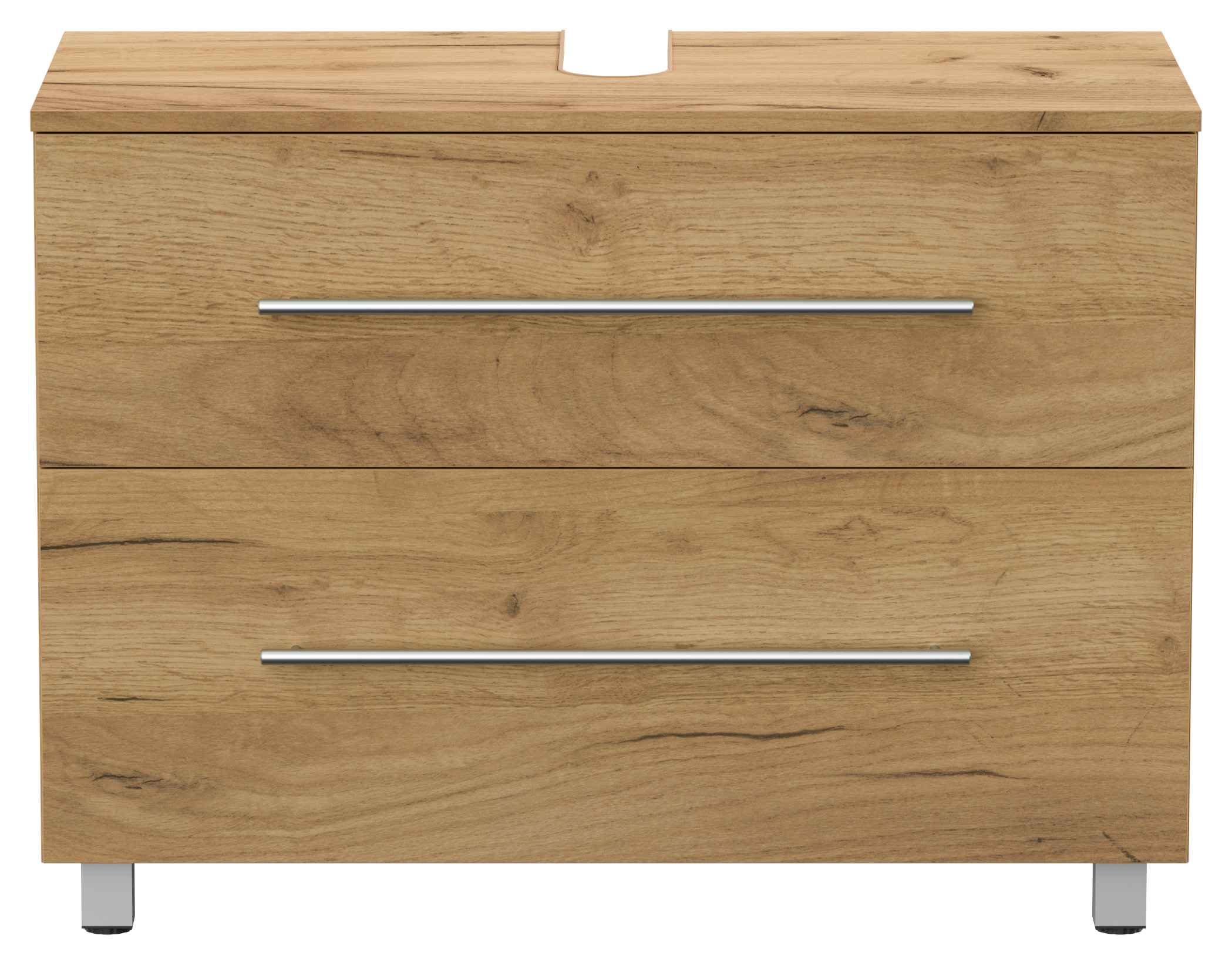 Ihr Waschbecken verwandelt sich in ein attraktives Badmöbel mit diesem Universal Unterbau. Der 85 cm breite Waschbeckenunterschrank mit den Oberflächen in der Farbe gold eiche wurde für Waschbecken bis zu 100 cm Breite entworfen. Ihr Bad wirkt mit diesem Waschtischunterschrank sofort eleganter. Sie stellen - ohne sanitärtechnische Vorarbeiten - den Waschtischunterschrank unter Ihr Waschbecken - fertig!Der Waschbeckenunterschrank besitzt zwei Schubladen mit extra breiten Griffen aus gebürstetem Edelstahl. Das komfortable Soft-Close-System garantiert selbsttätiges, weiches Schließen der Schubfächer und gestattet deren Vollauszug. Sie werden die größere Übersicht in Ihrem Waschbeckenunterschrank schnell zu schätzen wissen. Das Badmöbel ohne Waschbecken wird als Universal Unterbau in zerlegter Form geliefert. Gestalten Sie Ihr Bad mit wenig Aufwand neu - machen Sie mit diesem Waschbeckenunterschrank aus Ihrem Waschbecken ein elegantes Badmöbel!Nicht im Lieferumfang enthalten sind das Waschbecken, Deko, Spiegel, Armatur, Zuleitungen zum Wasserhahn, Siphon sowie in der Regel ebenfalls nicht der Waschbeckenverschluss Popup. Diese Artikel können gesondert bei uns erworben werden.
