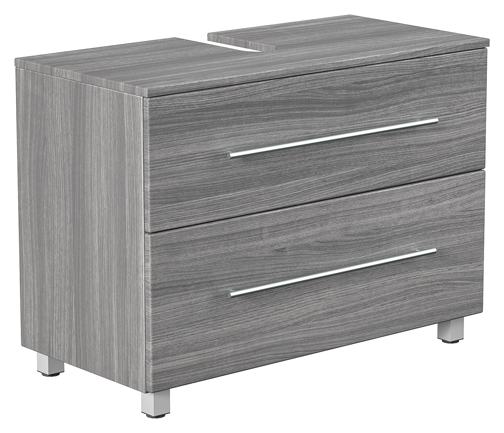 Ihr Waschbecken verwandelt sich in ein attraktives Badmöbel mit diesem Universal Unterbau. Der 85 cm breite Waschbeckenunterschrank mit den Oberflächen in der Farbe Silbereiche wurde für Waschbecken bis zu 100 cm Breite entworfen. Ihr Bad wirkt mit diesem Waschtischunterschrank sofort eleganter. Sie stellen - ohne sanitärtechnische Vorarbeiten - den Waschtischunterschrank unter Ihr Waschbecken - fertig!Der Waschbeckenunterschrank besitzt zwei Schubladen mit extra breiten Griffen aus gebürstetem Edelstahl. Das komfortable Soft-Close-System garantiert selbsttätiges, weiches Schließen der Schubfächer und gestattet deren Vollauszug. Sie werden die größere Übersicht in Ihrem Waschbeckenunterschrank schnell zu schätzen wissen. Das Badmöbel ohne Waschbecken wird als Universal Unterbau in zerlegter Form geliefert. Gestalten Sie Ihr Bad mit wenig Aufwand neu - machen Sie mit diesem Waschbeckenunterschrank aus Ihrem Waschbecken ein elegantes Badmöbel!Nicht im Lieferumfang enthalten sind das Waschbecken, Deko, Spiegel, Armatur, Zuleitungen zum Wasserhahn, Siphon sowie in der Regel ebenfalls nicht der Waschbeckenverschluss Popup. Diese Artikel können gesondert bei uns erworben werden.